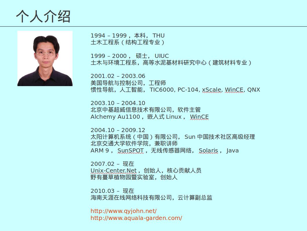 结合前段时间对不同虚拟化管理软件的评测工作,准备了一套讲座用的幻灯片。PDF版本的文件可以从这里下载。如果有人需要ODP版本的文件,直接跟我联系吧。