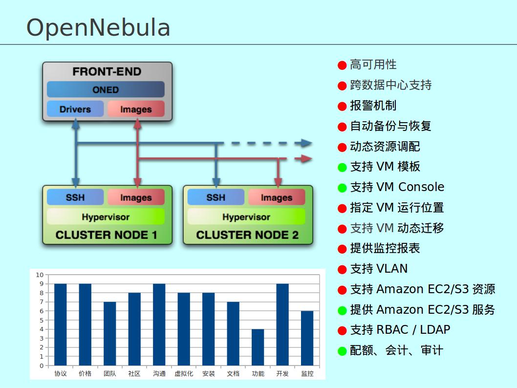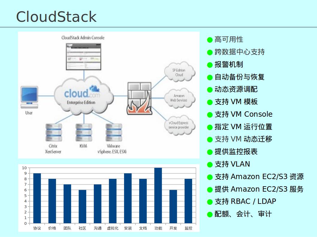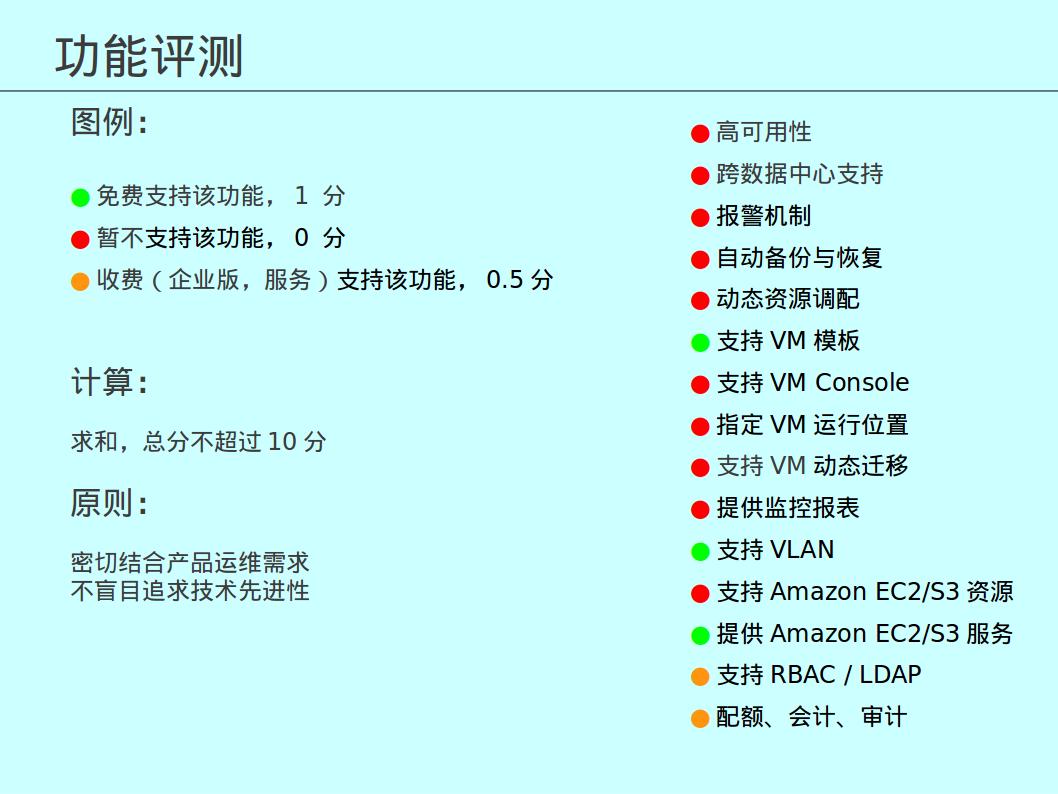 @qyjohn 有幸通过google找到你的blog,这篇文章可谓是国内第一篇全面而有深度的比较。 但有些术语搞不清: o 跨数据中心支持 o 自动备份与恢复 o 动态资源调配 o 支持VLAN o 支持RBAC o 配额