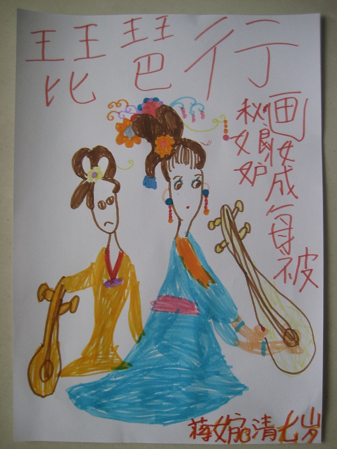 [...] 婉清的画,大都是有故事的。她的画虽然笔迹稚嫩,但是充满了想象力和创造力。例如《妆成每被秋娘妒》 是白居易的长诗《琵琶行》里面的情景,《大火的书》是火的来历和演变,《阿里米斯里和伊宰尔图》是《一千零一夜》里面的故事,《翻跟头的小女孩》起源于杨丽萍的孔雀舞,等等等等。我最喜欢的,还是她快满五岁时画的连环画《将进酒》和《寻隐者不遇》。有人说小孩子背古诗大都是机械记忆,虽然背得下来,但不是真懂。从婉清的画里,我们欣慰地看到她是真的懂得了《琵琶行》,懂得了《将进酒》,懂得了《寻隐者不遇》。 [...]