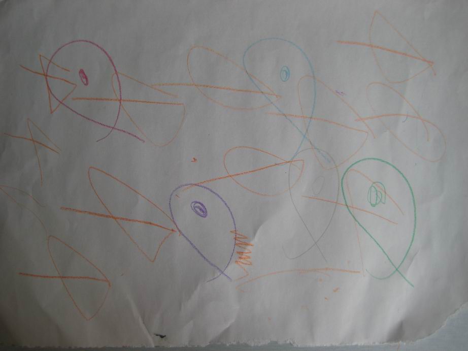 一个月前,云舒在婉清的书桌边上玩。书桌上有一些白纸和彩笔,云舒就拿起笔来画着玩。过了一会,她又兴奋地大声说道:“鱼!”我们过去一看,画得还真像!
