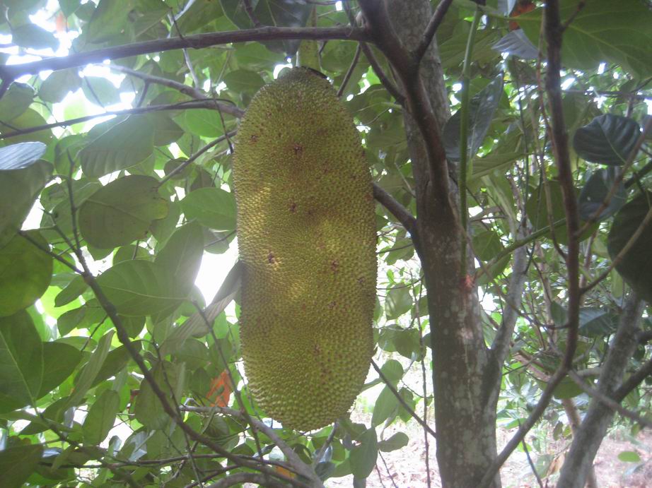 马来西亚一号菠萝蜜。2009年种下的树苗,今年第一次结果。(去年也开花了,但是没有成功结果 -- 仅有的一两个半大果子被虫子吃掉了。)