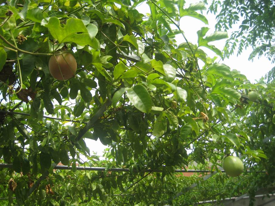 百香果。2008年开始种下最早的两株,当年冬天就结果了。现在院子里头已经有十多株了,新的小苗还在不断地往外冒。预计到明年夏天的时候,所有的房子都会被百香果所覆盖,到时候就不用开空调了。