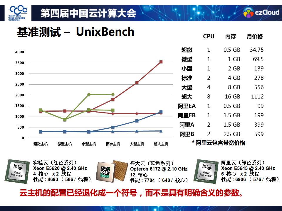 表面上配置较高(并且价格也更高)的云主机,由于采用了相对低端的CPU,其性能比表面上配置较低的云主机更低。这就验证了我刚刚说过的一句话:“云主机的配置已经退化成一个符号,不再是一个具有确定意义的参数。不但不同IaaS服务提供商之间的产品无法基于配置来进行比较,同一IaaS服务提供商的不同产品之间也很难基于配置来进行比较。”通过这个例子我们还可以看出,阿里云在基础构架服务产品的设计方面,还是比较业余的。