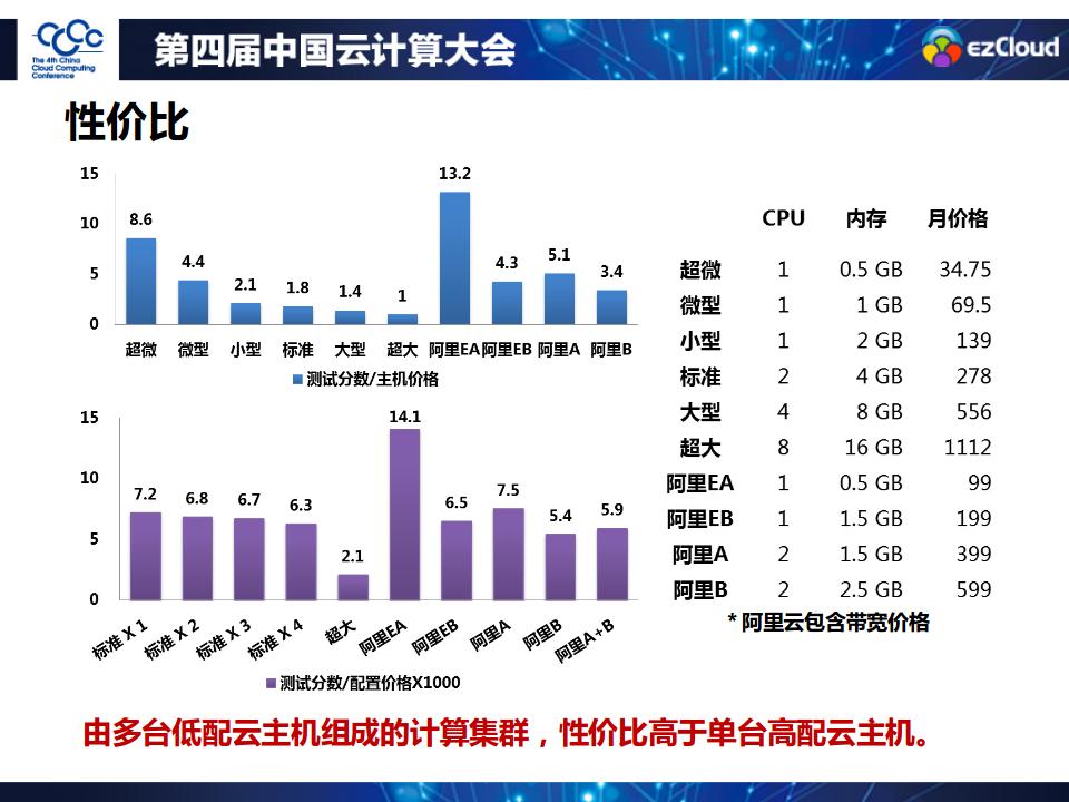 各位是不是还记得,在上一张幻灯片中我们提到,盛大云超大主机的配置和价格都是标准主机的四倍?换句话说,由四台标准主机组成的集群,在配置和价格上等同于一台超大主机。再换句话说,如果我们使用超大主机的话,性价比是不是有点问题?