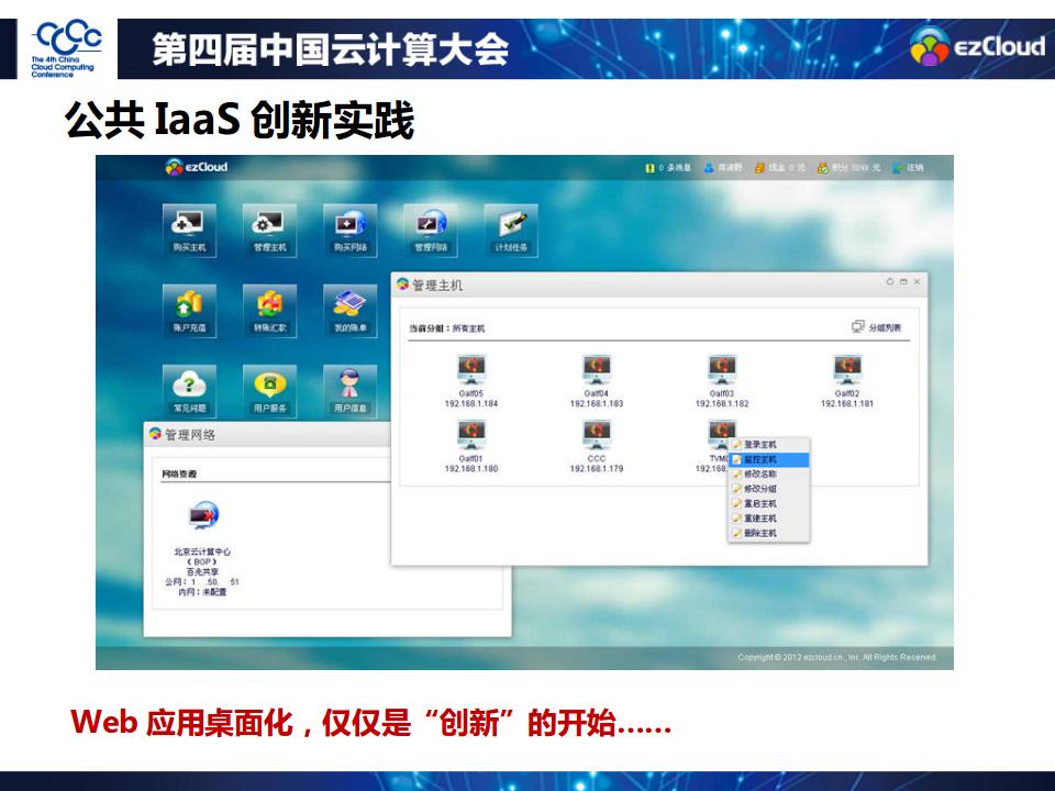Web应用桌面化仅仅是创新的开始。在基础构架服务逐渐成为趋势的大前提下,如何有效定义云主机的配置参数,如何在超售的同时保证云主机的性能,如何帮助客户快速创建高性能的计算集群,如何帮助客户实现自动化的横向扩展,怎么样帮助客户从原来的硬盘存储方案平滑过度到云存储方案,怎样实现云存储与CDN的无缝融合,都是我们团队正在深入研究的内容。