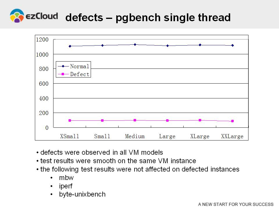 在pgbench测试中,我们还发现了一些令人困惑的现象。同一规格的虚拟机,其pgbench单线程测试结果存在非常大的差异。就像这张图表所展示的一样,在存在问题的虚拟机上,pgbench单线程的性能只有正常虚拟机的1/10不到。在统一规格的虚拟机上运行同样的应用,竟然存在如此之大的性能差距,从常理来推断应该不是设计行为。因此,我们将这一现象定性为缺陷。