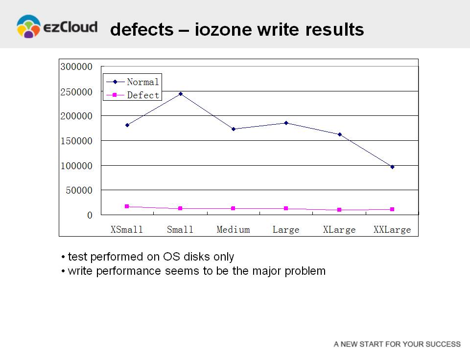 刚才我们已经提到,数据库基准测试是典型的磁盘IO密集型应用。可以推断,出现缺陷的虚拟机后端的存储系统可能存在配置方面的问题。这个配置影响到磁盘写入性能,但是对磁盘读取性能没有显著影响。