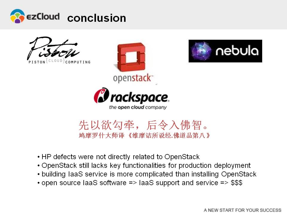 我在一年之前发表过一篇题为《开源IaaS软件的比较 — 构架、功能、社区、商业及其他》的博客文章,其中最后一章引用了鸠摩罗什大师所译的《维摩诘所说经》中这么一句话:“先以欲勾牵,后令入佛智。” 一年后的今天,我依然认为这句话完美地阐释了开源IaaS软件的发展趋势。