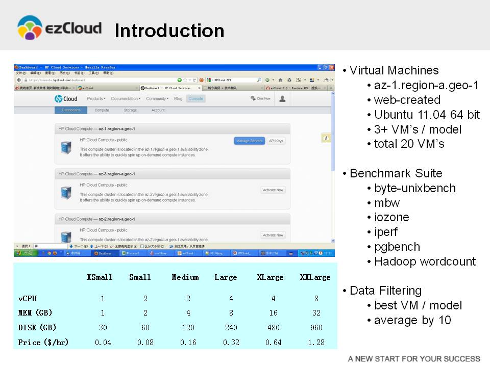 幻灯片上的这张截图,是HP Cloud Service的用户界面。在这次测试中,所有的虚拟机都是通过基于浏览器的用户界面创建的,并且集中在az-1.region-a.geo-1这个可用域里。HP Cloud Service提供了多个版本的CentOS、Debian、Fedora和Ubuntu操作系统,在我们的测试中选用的操作系统为Ubuntu 11.04 64 bit服务器版。幻灯片上着个表格列出了HP Cloud Service所提供的虚拟机规格、配置和价格。每个规格的虚拟机,至少创建3 个实例来进行比较。在有必要的情况下,还要创建更多个实例。在整个测试中,一共创建了20台虚拟机。