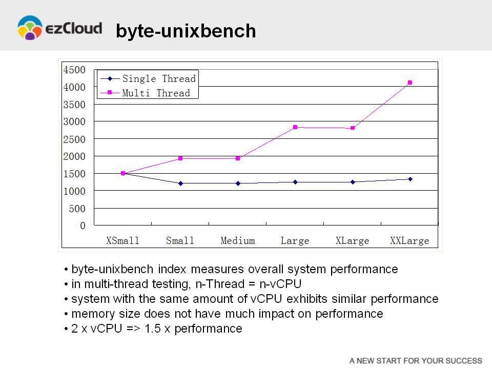 在这张图表上有两条曲线,其中蓝色的曲线代表单线程的测试结果,红色的曲线代表多线程的测试结果。在多线程测试中,线程的个数等于虚拟机的vCPU颗数。可以看到,在单线程测试中,所有虚拟机的测试结果是非常接近的,因为它反映的是单颗vCPU的处理能力。在多线程测试中,具有同样数量vCPU的虚拟机的测试结果是基本一致的,内存大小对测试结果基本上没有影响。此外,测试结果的增长慢于vCPU数量的增长。当vCPU的数量增长一倍(乘以2)的时候,测试结果的数值增长0.5倍(乘以1.5)。这样的测试结果,和我们在其他IaaS平台(例如盛大云和阿里云)上观察到的现象是一致的。