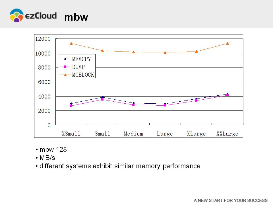 我们使用mbw来测试虚拟机的内存性能。mbw通常用来评估用户层应用程序进行内存拷贝操作所能够达到的带宽。这张图表上橙色、粉色和蓝色的曲线分别代表三种不同的内存拷贝方式在一秒钟里能够拷贝的内存大小。可以看到,对于任何一种测试方法,所有规格的虚拟机的内存带宽基本上是一样的。