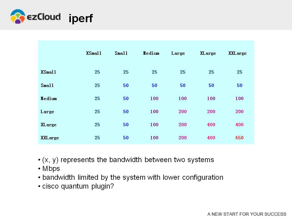 接下来我们看一下HP Cloud Service的内网带宽状况。在如图所示的这个矩阵中,数据点(X, Y)的数值代表两台虚拟机之间的带宽。可以看出,两台虚拟机之间的内网带宽是由配置较低的虚拟机所决定的。超小型主机(XSmall)与其他任意主机之间只有25 Mbps的带宽,小型主机(Small)与其他任意主机之间只有50 Mbps的带宽,中型主机(Medium)是100 Mbps,大型主机(Large)是200 Mbps,超大型主机(XLarge)是400 Mbps,特大型主机(XXLarge)是650 Mbps。