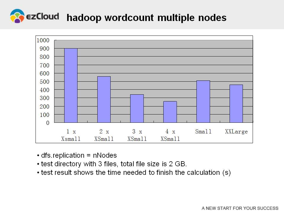 在上一张胶片中,我们比较的是不同规格的虚拟机的Hadoop wordcount性能。接下来我们看看由多台虚拟机组成的Hadoop集群会有什么样的性能。从上面这张图表中可以看出,随着计算集群中主机数目的增加,完成测试所需要的时间越来越短,表明计算集群的整体处理能力越来越强。由两台超小型主机(2 x XSmall)组成的集群,其性能与单台小型主机(Small)接近。由三台超小型主机(3 x XSmall)组成的集群,其性能明显超过单台特大型主机(XXLarge)。
