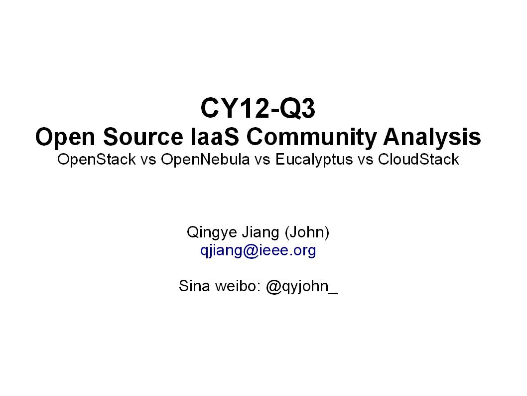 [...] 本文是对《CY12-Q3 OpenStack, OpenNebula,Eucalyptus,CloudStack社区活跃度比较》一文的补充和更新。对本文内容感兴趣的读者,可以通过电子邮件或者新浪微博(@qyjohn_)与我联系。 [...]