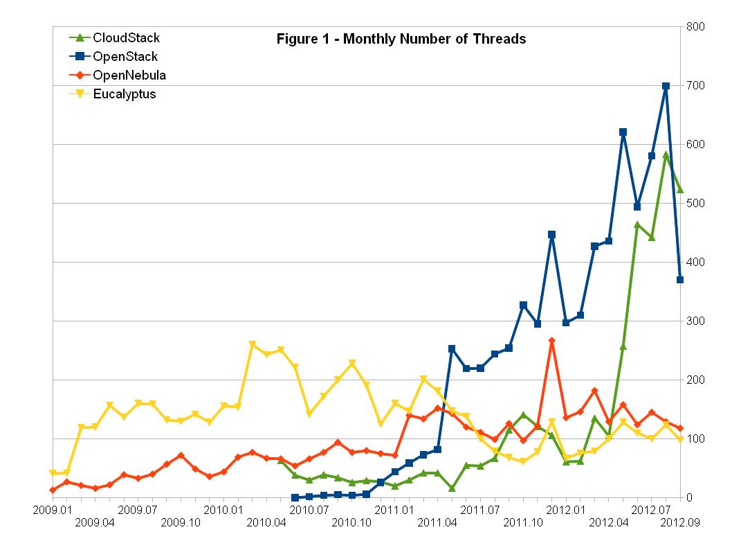 (1) 与OpenStack和CloudStack相关的讨论数量远大于与Eucalyptus和OpenNebula相关的讨论数量;
