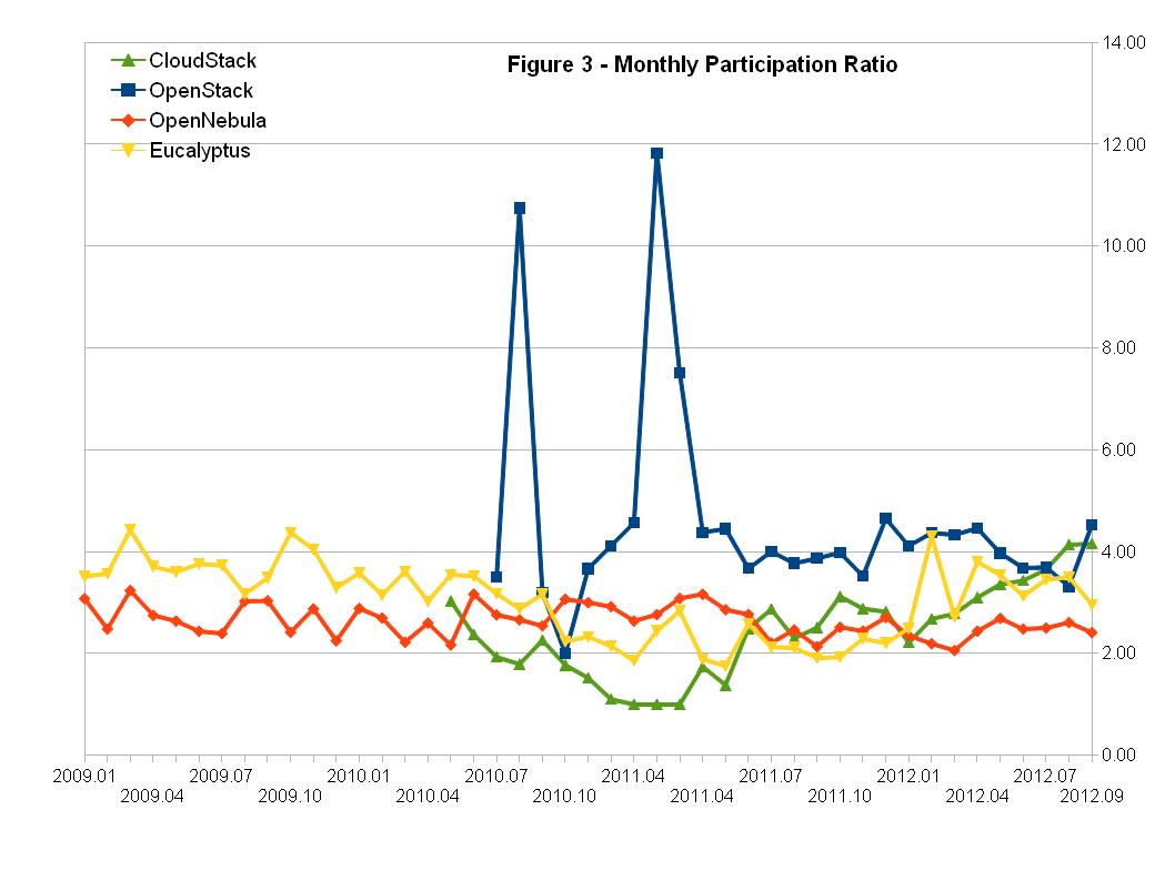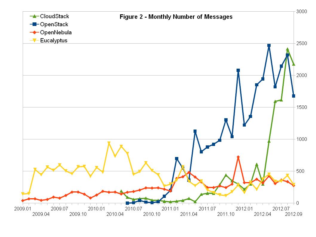 CY12-Q3 OpenStack, OpenNebula,Eucalyptus,CloudStack社区活跃度比较
