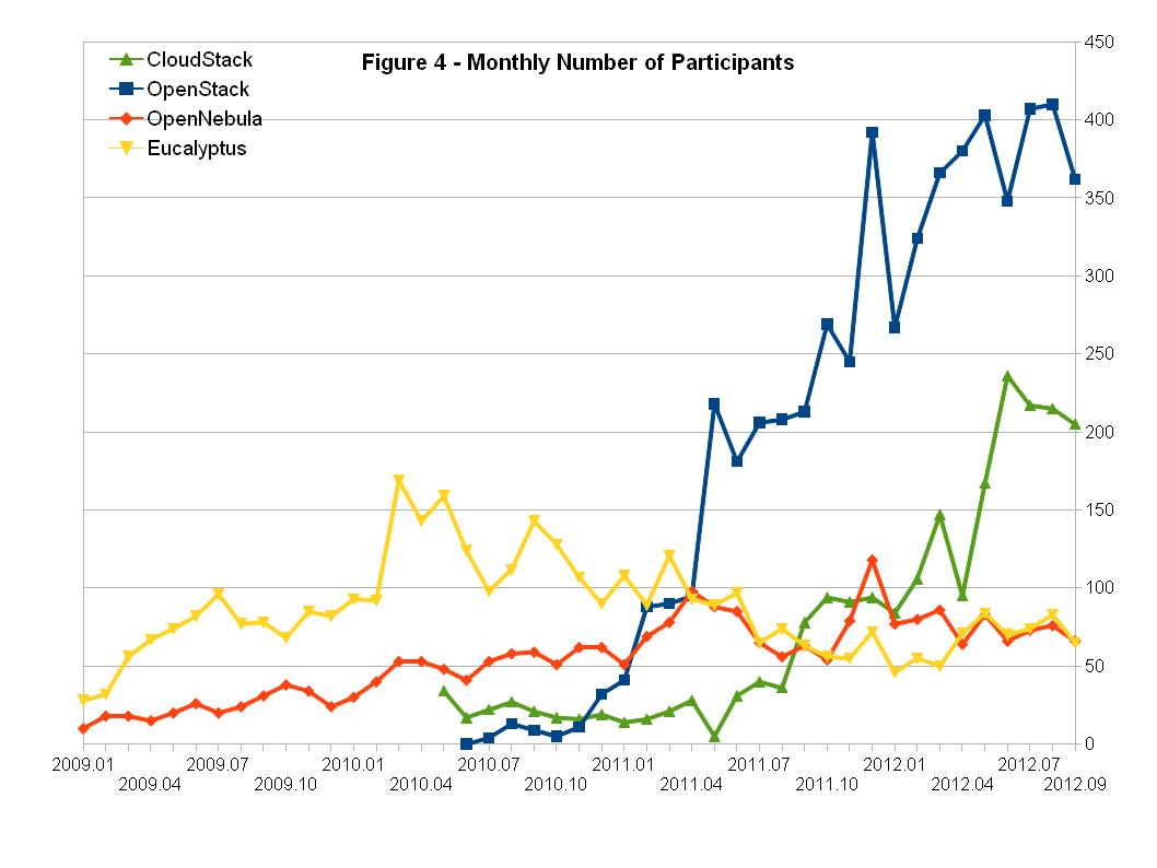 图4 所示为这四个项目每个月参与论坛或者邮件列表讨论的总人数。可以看出,CloudStack与OpenStack的活跃用户数量要远大于OpenNebula和Eucalyptus。但是,在过去三个月中,CloudStack与OpenStack的活跃用户数量均有一定程度的下降。