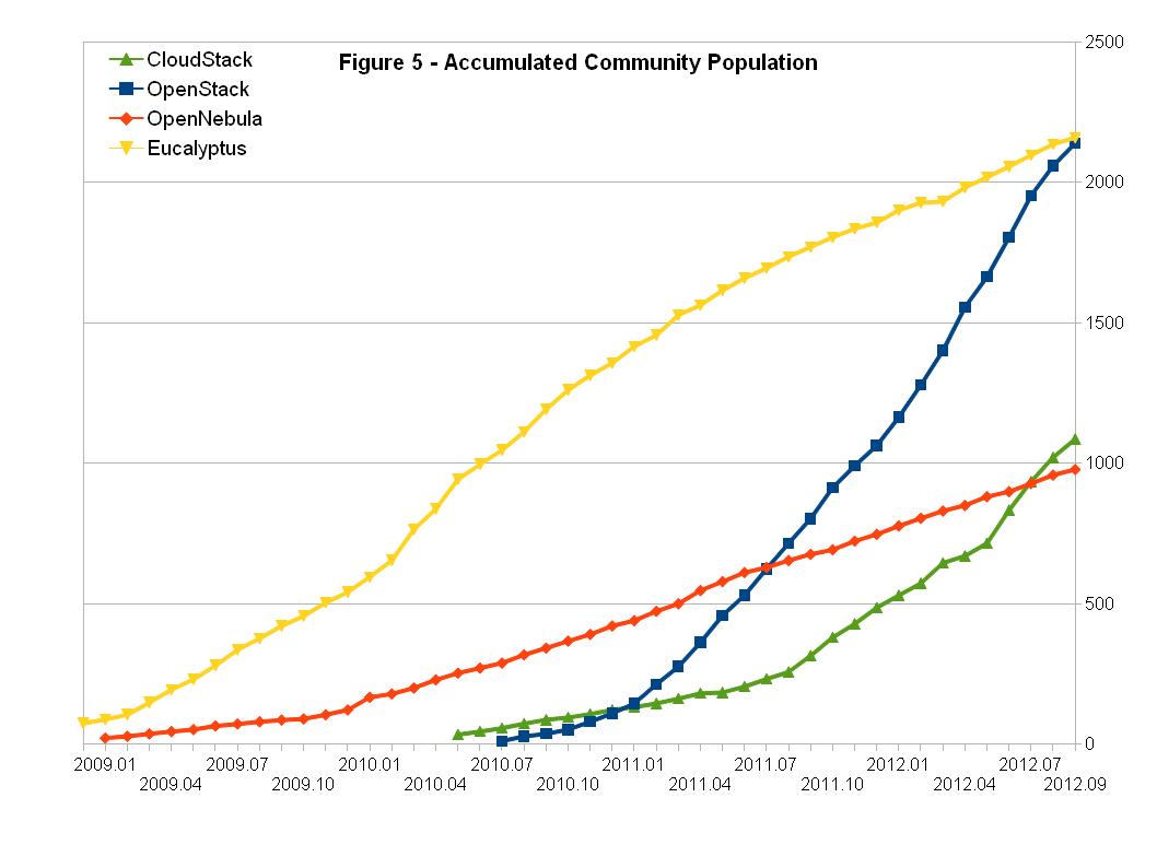 图5 所示为这四个项目的社区人口增长趋势。Eucalyptus的社区人口依然领先,但是OpenStack正在迎头赶上。可以预见,OpenStack项目的社区人口将会在CY12-Q4超越Eucalyptus。在CY12-Q2报告中,我们预测过CloudStack的社区人口很快将超过OpenNebula。事实上,CloudStack仅仅花了一个月时间就实现了这个目标。