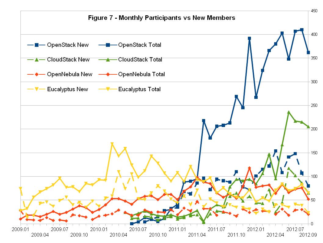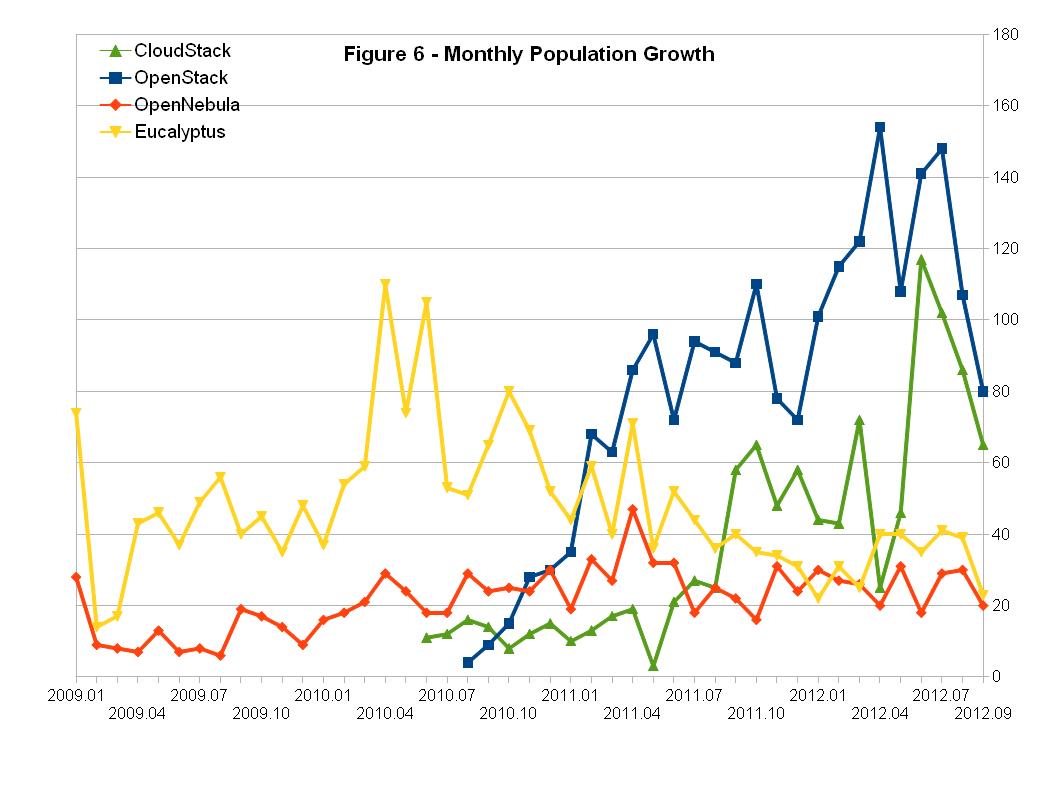 图6 所示为这四个项目每个月新增加的社区人口数量。在过去三个月中,CloudStack与OpenStack的社区人口增长速度基本相当。