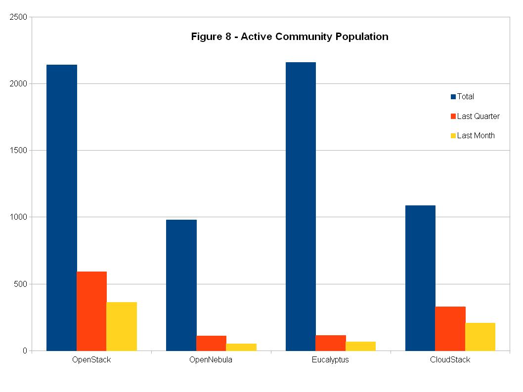 (2) 在过去一个季度中,OpenStack的活跃人口最多,然后是CloudStack、Eucalyptus、OpenNebula;