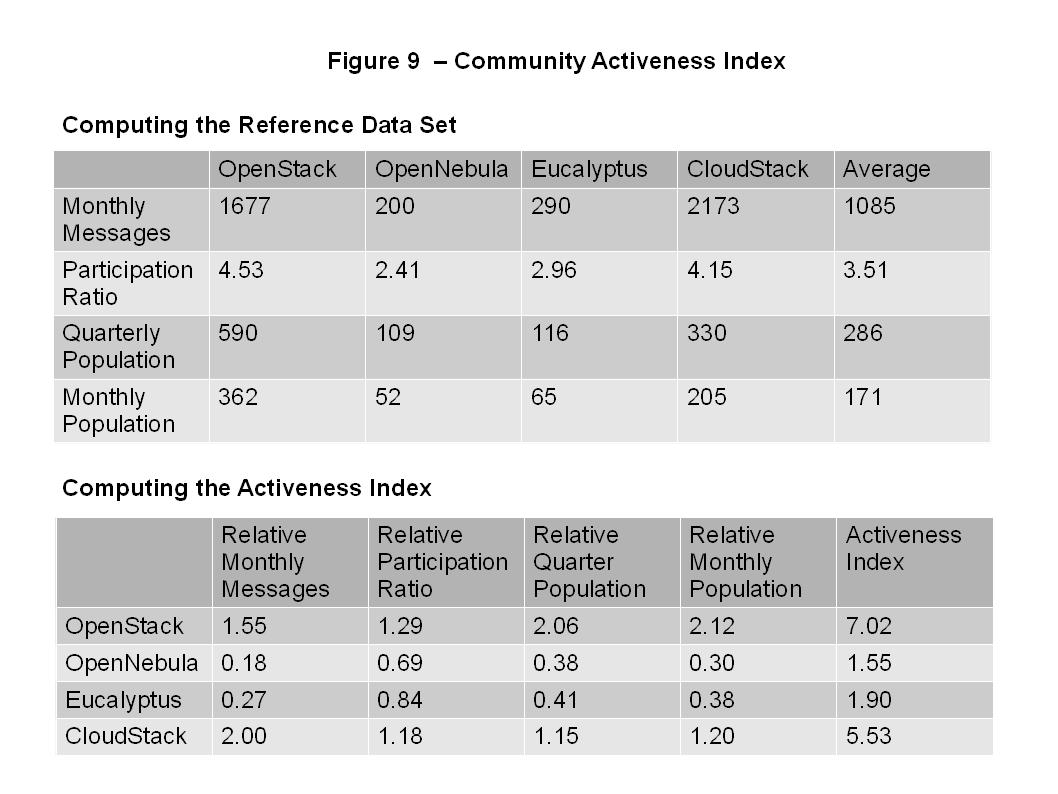 从图9 中可以看出,目前OpenStack项目的“社区活跃度指数”最高(以明显的优势领先),然后是CloudStack、Eucalyptus、 OpenNebula。