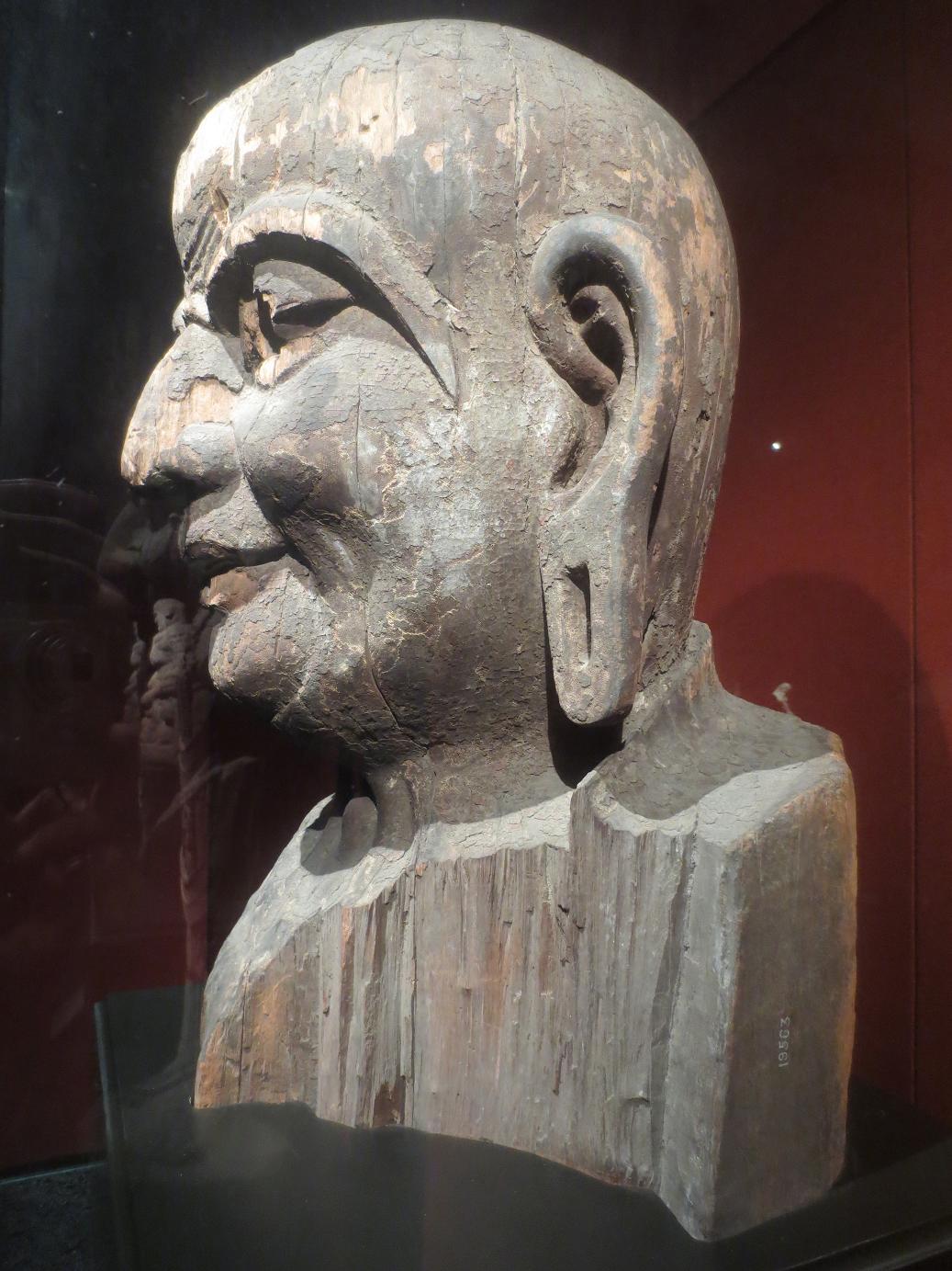 唯一的例外是这件唐朝的木雕迦叶头像。历尽千年沧桑的高僧,脸容依然慈祥,眼神依然在笑,第一眼看见就很喜欢。