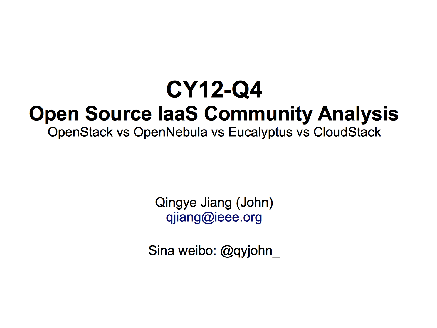 This article is an update version of my previous article CY12-Q3 Community Analysis — OpenStack vs OpenNebula vs Eucalyptus vs CloudStack. Readers who are intested in further discussions please contact me via email at the above-mentioned address.
