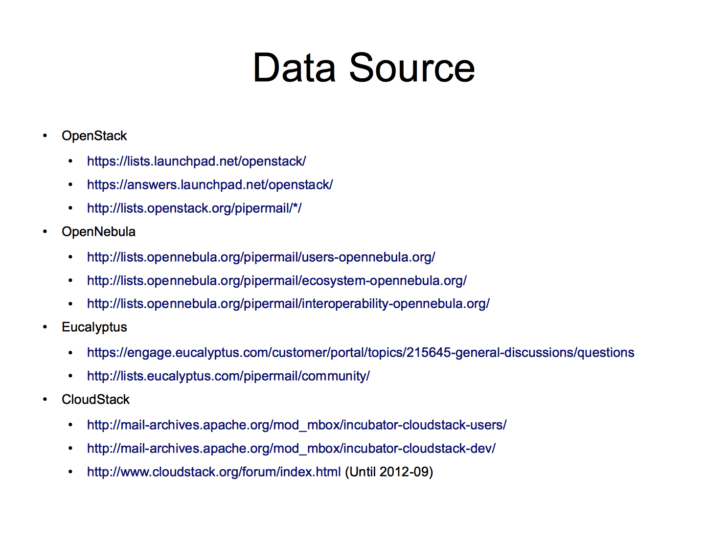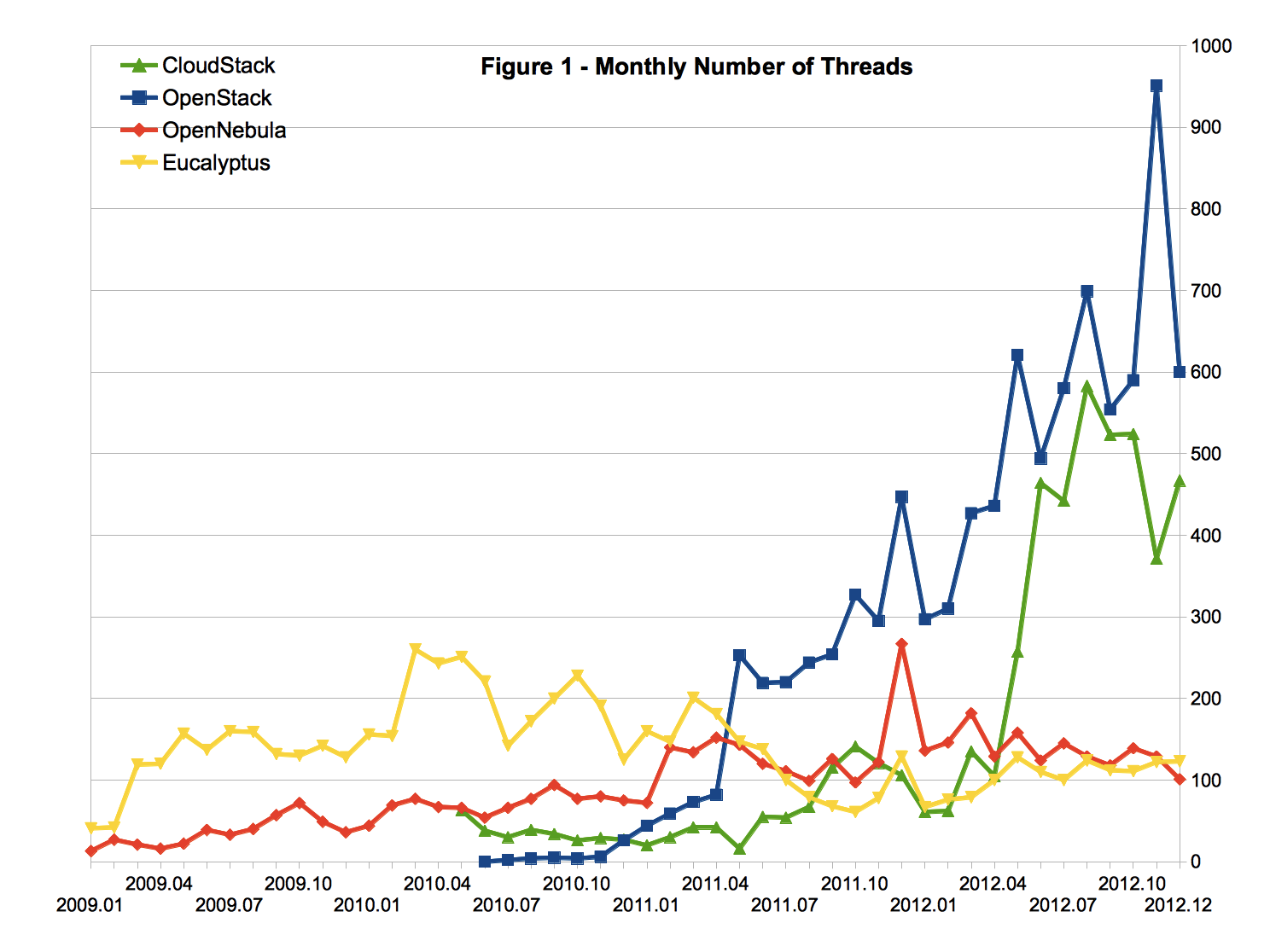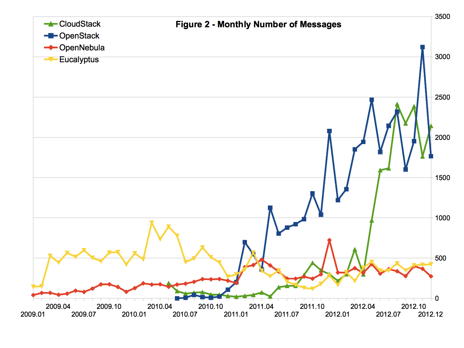 (1) the volume of OpenStack and CloudStack related discussions is much higher than that of Eucalyptus and OpenNebula; and