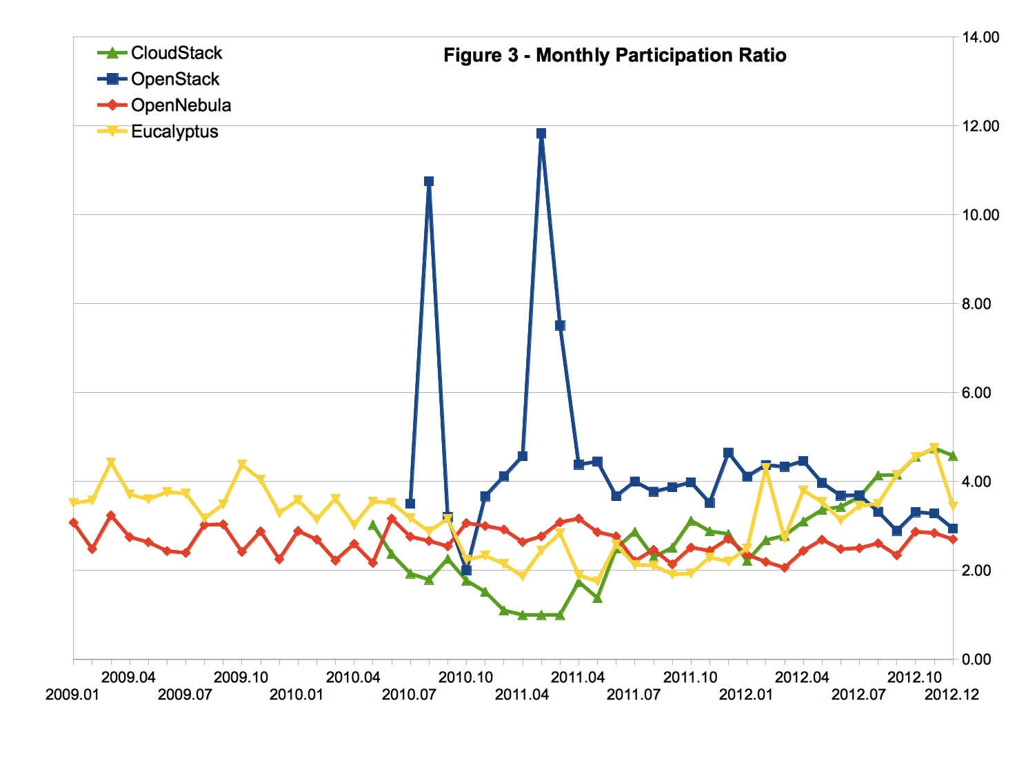 In the past the OpenStack project had a much higher participation ratio than the others. However, during the past 6 months, the participation ratio of CloudStack and Eucalyptus are growing steadily, while the participation ratio of OpenStack is decreasing gradually. Currently CloudStack and Eucalyptus have the highest participation ratios, which are close to 4. OpenStack and OpenNebula have relatively low participation ratios, which are close to 3.