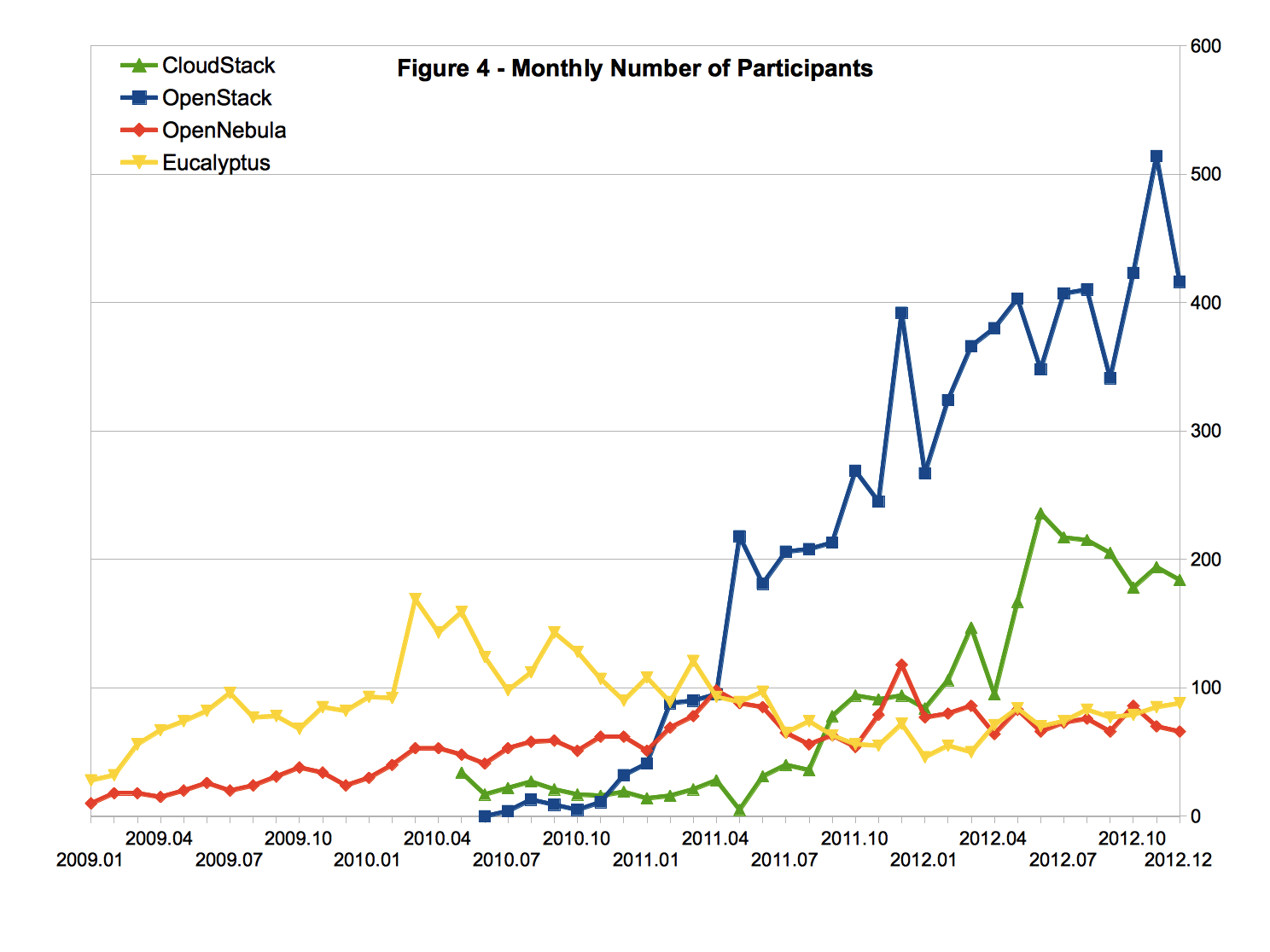 A Chinese version of this article is published at the same time, which can be found at CY12-Q4 OpenStack, OpenNebula, Eucalyptus, CloudStack社区活跃度比较.