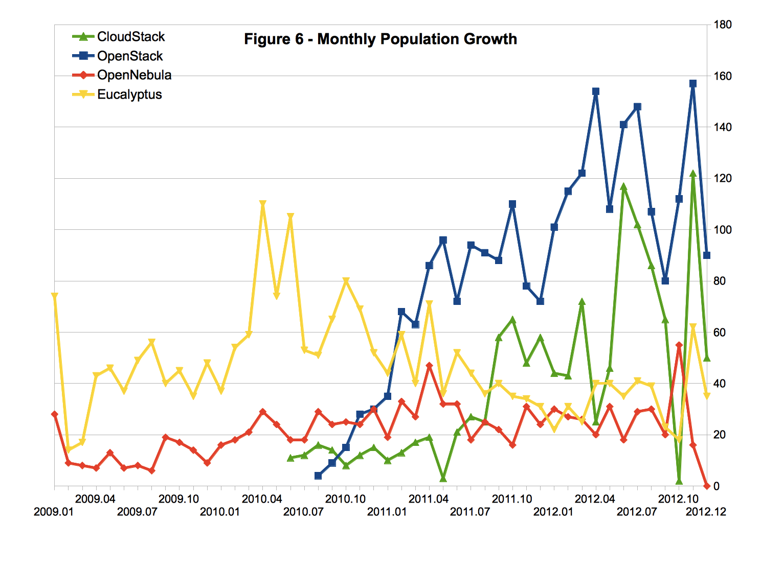 Figure 6 shows the monthly population growth of the four projects being discussed. During the past 3 months, the populations of OpenStack and CloudStack are growing at the same pace. (The CloudStack data exhibit an abnormal point at 2012-10 because we excluded the forum data from this analysis.)