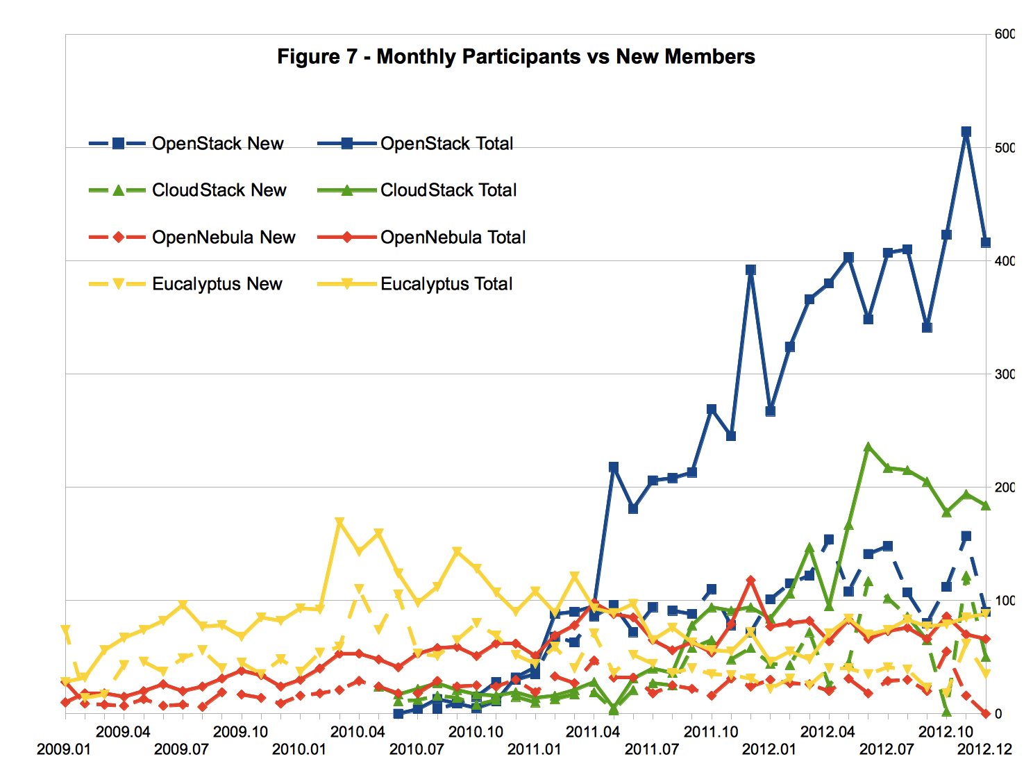 For OpenStack and OpenNebula, around 30% of their monthly participants are new members. For CloudStack and Eucalyptus, around 50% of their monthly participants are new members. This indicates OpenStack and OpenNebula communities are more “sticky” than CloudStack and Eucalyptus communities.