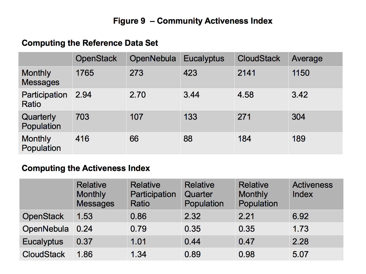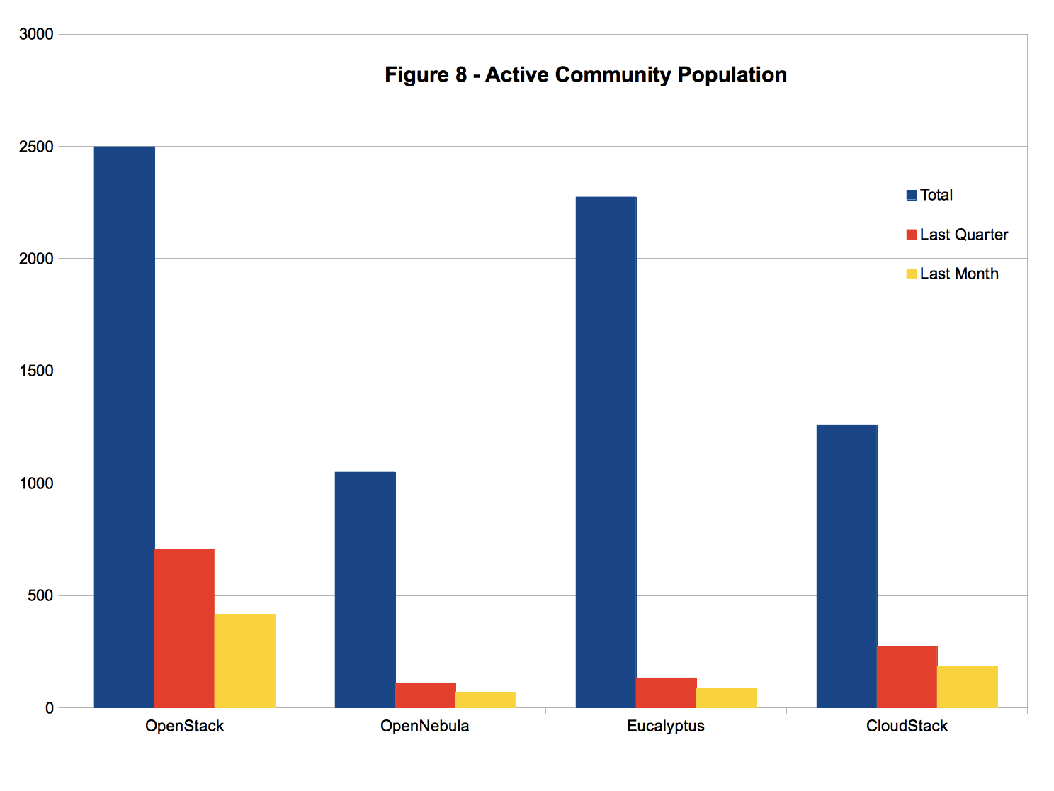 As can be seen from Figure 9, OpenStack is currently THE most active project (with obvious advantage), followed by CloudStack, Eucalyptus, and OpenNebula.