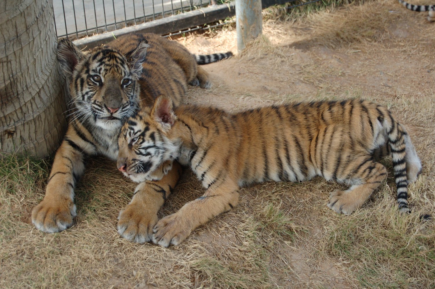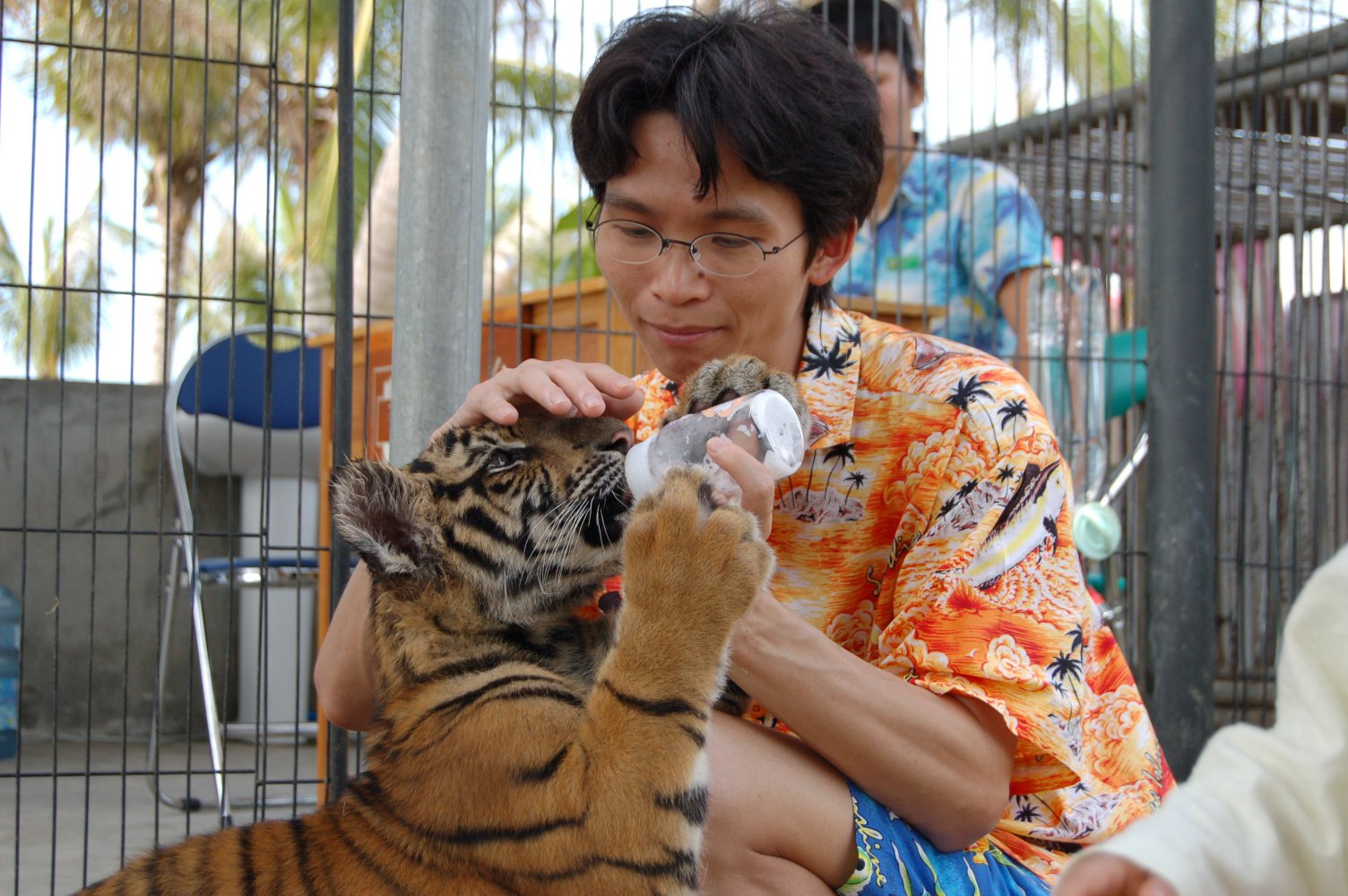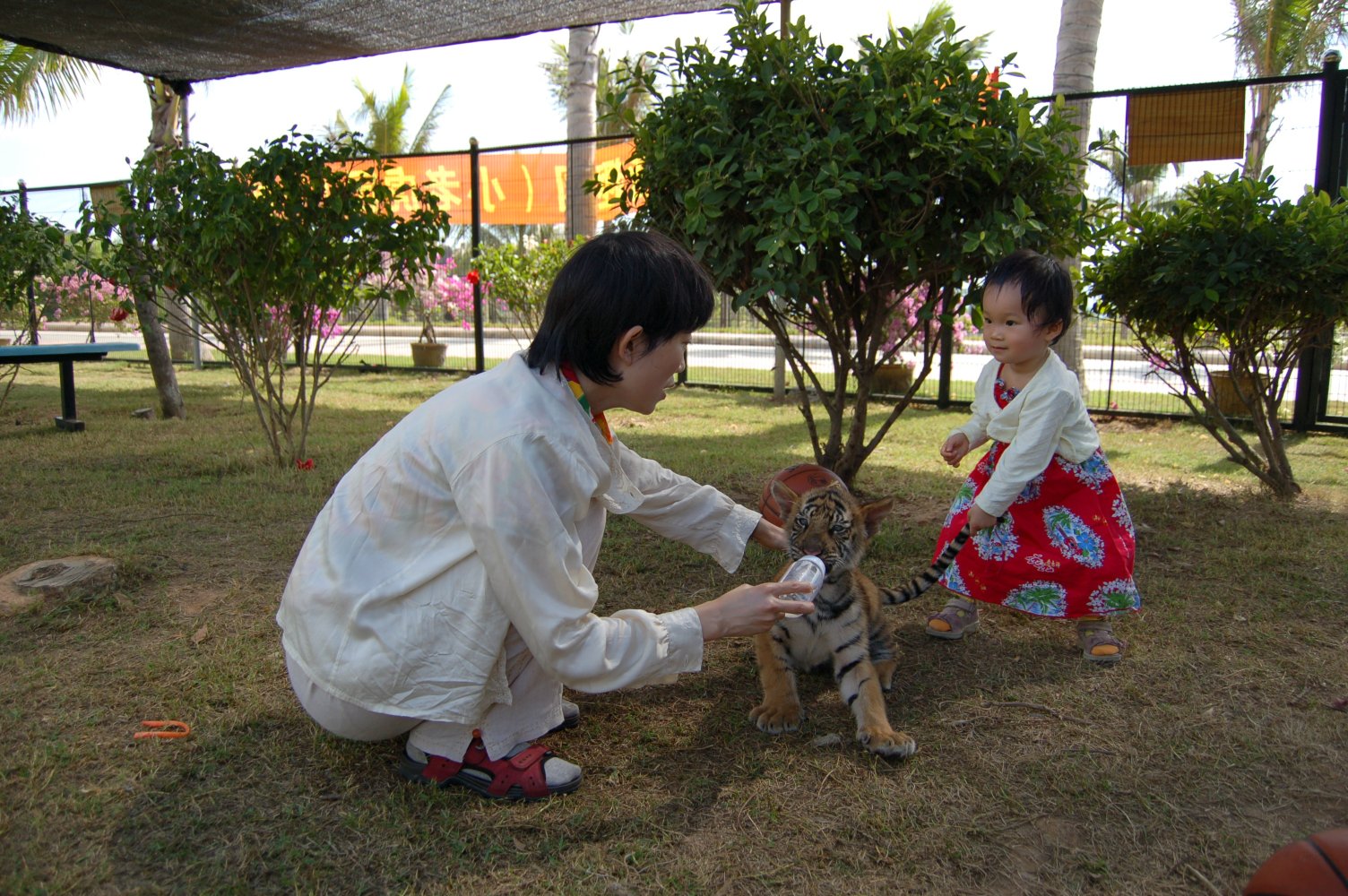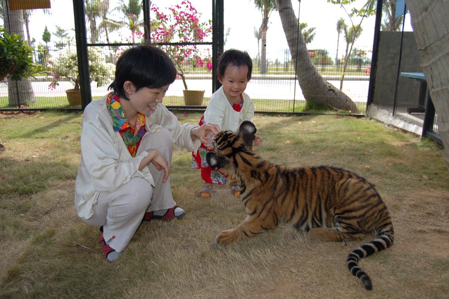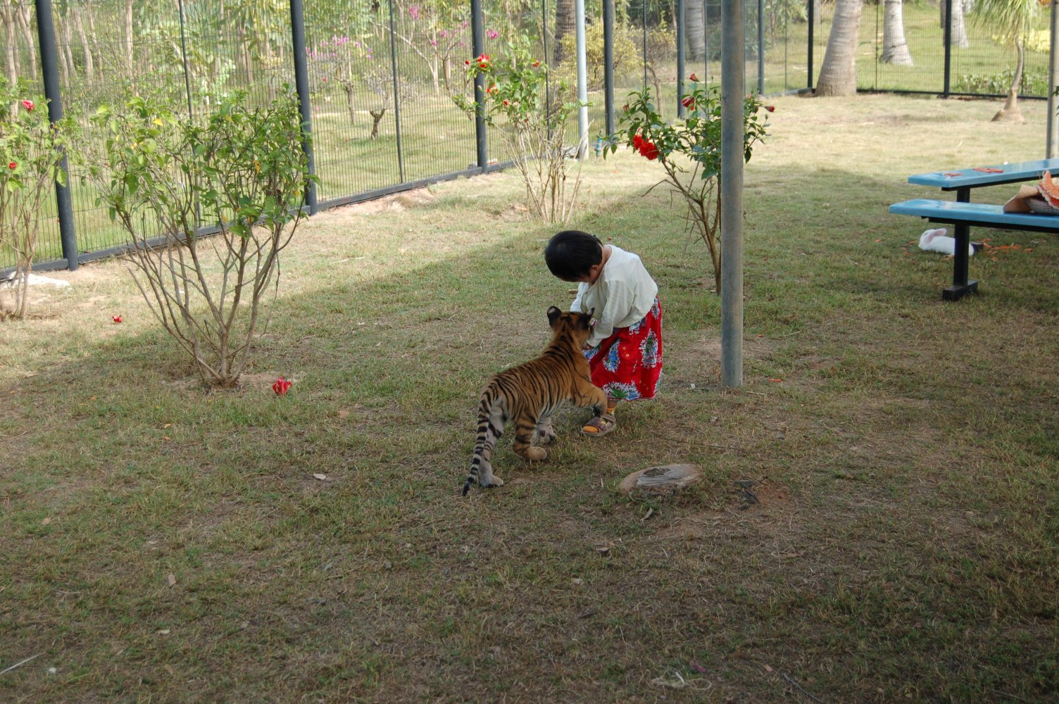 额外费用并且有足够的胆量的话,是可以进去围栏里面和小老虎玩耍的。