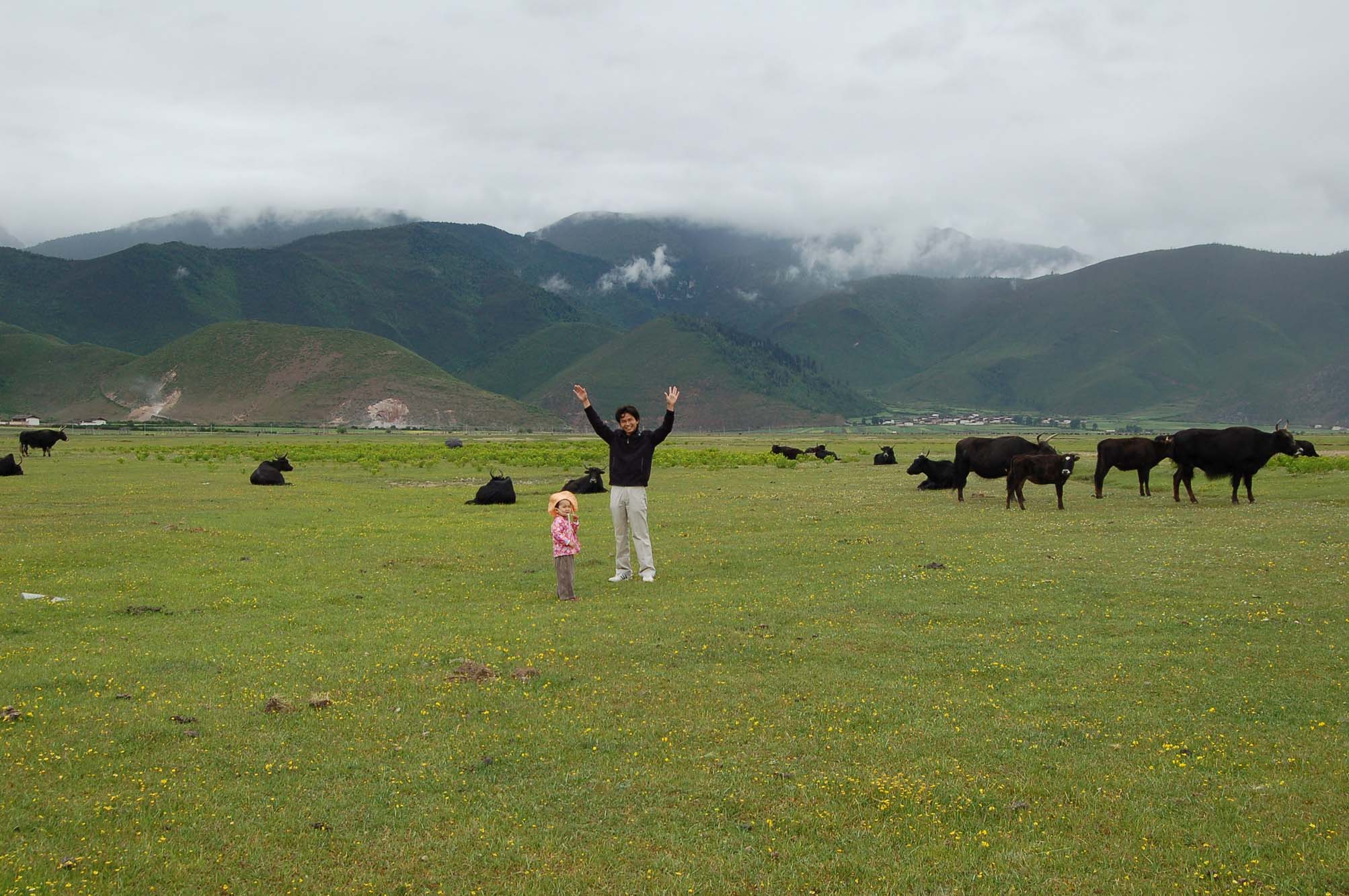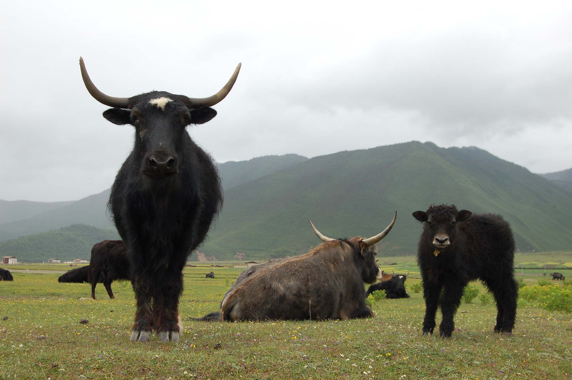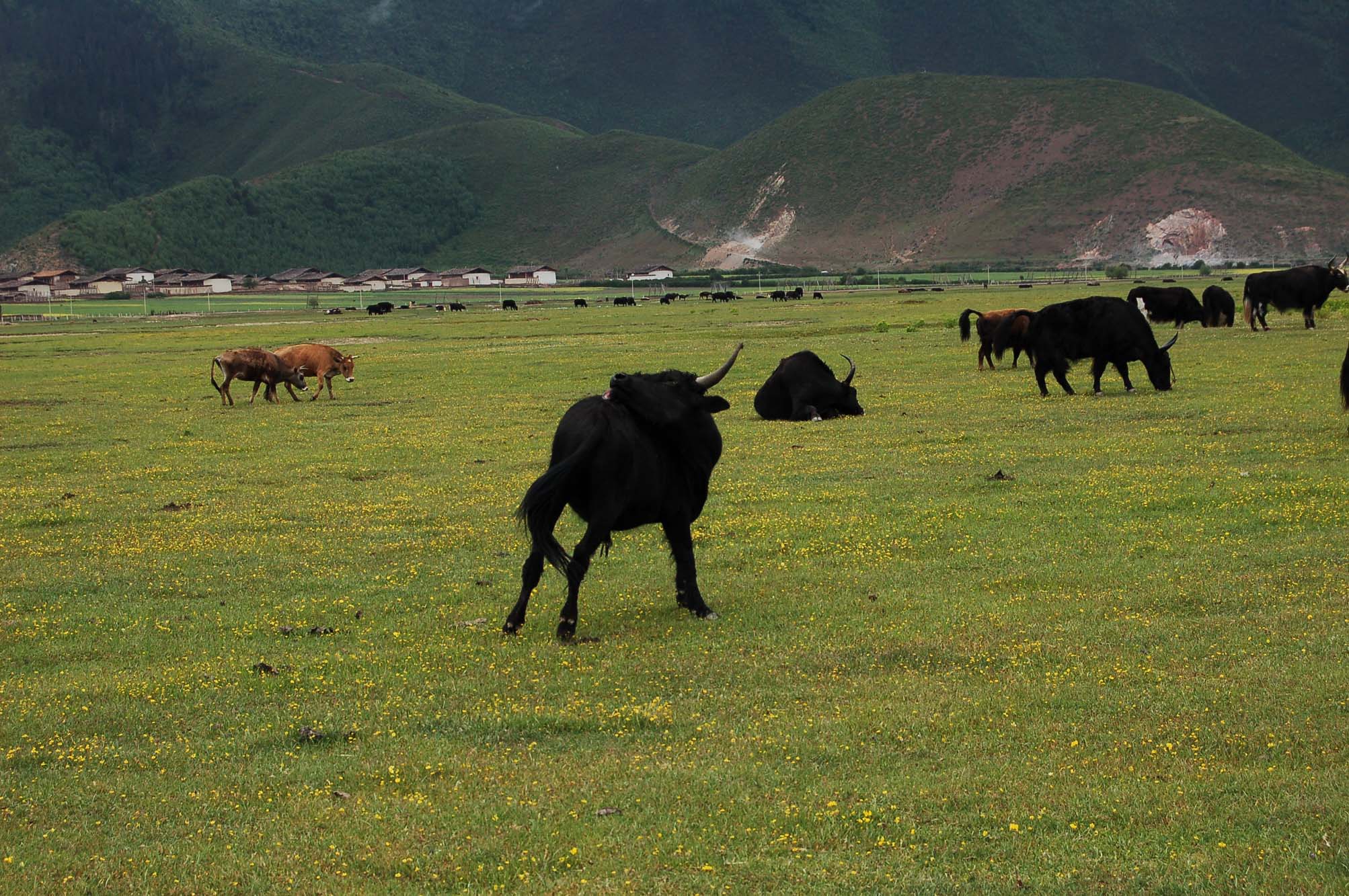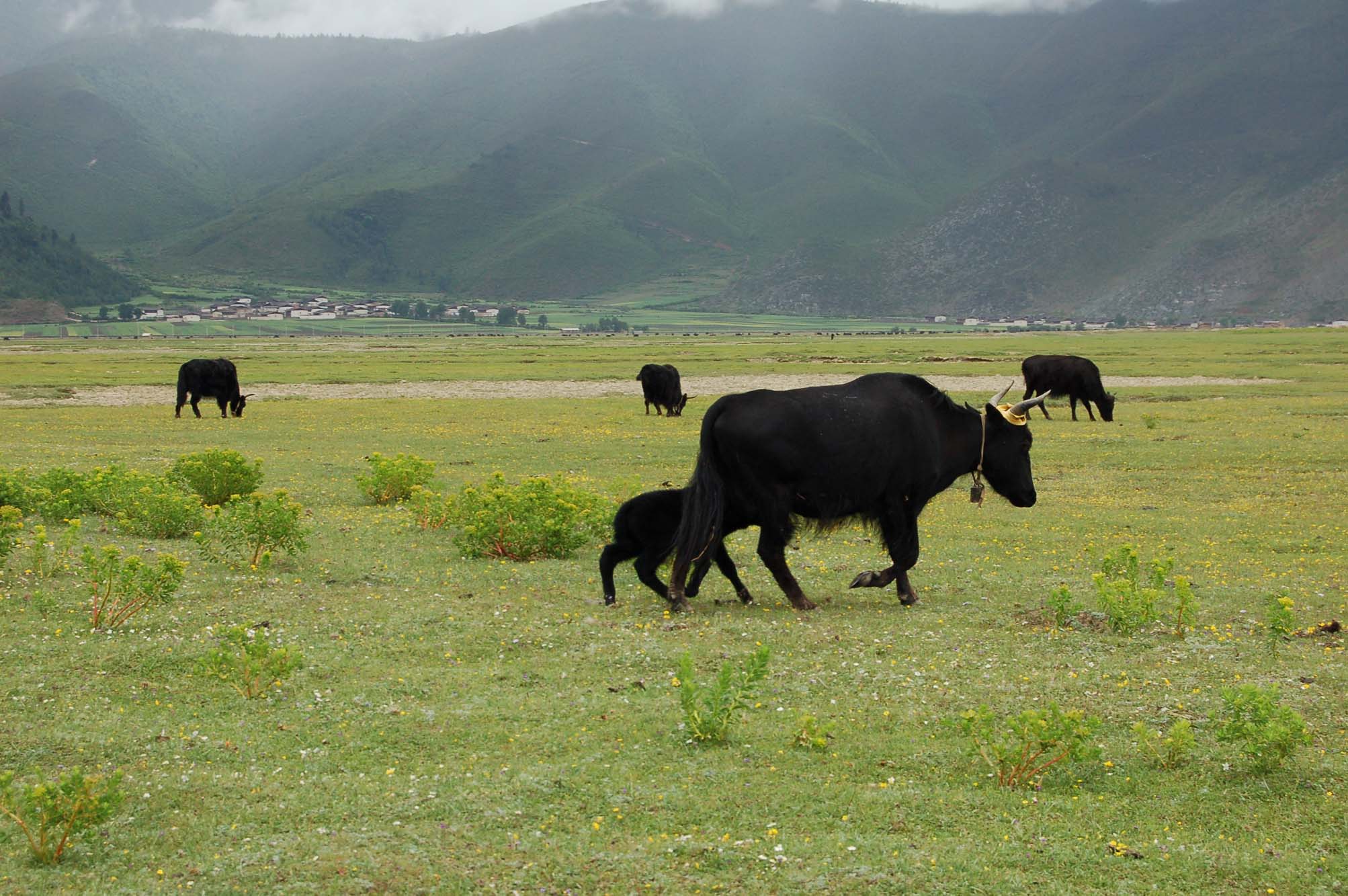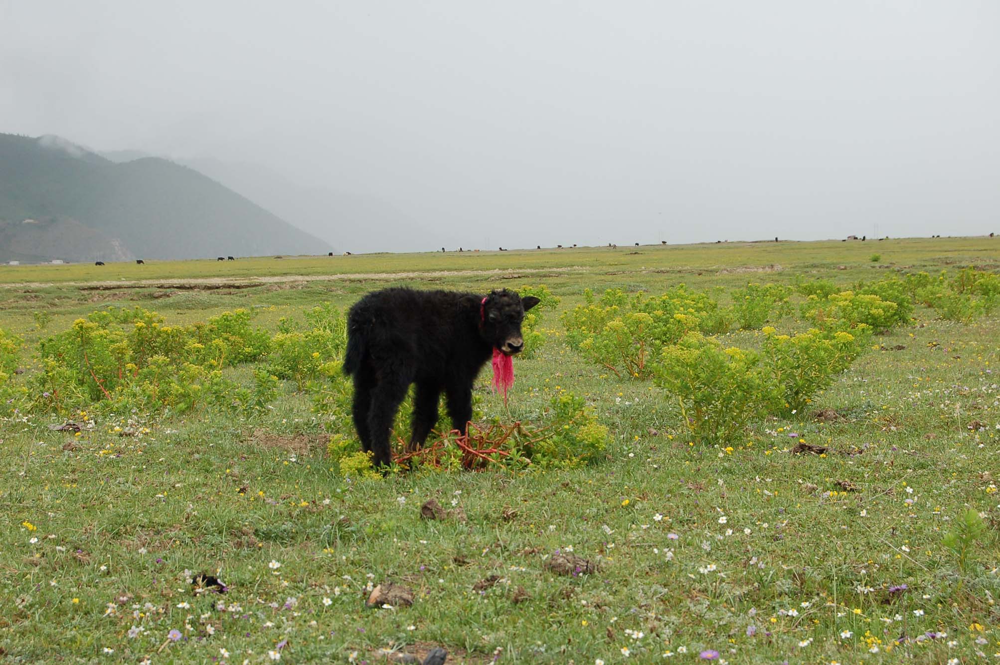 这只小牦牛站在一丛粗壮的黄色野花上面,用一种很无辜的眼神看着我们。牵马的藏族小姑娘告诉我们,这只小牦牛看起来还没有一个月大。很显然它对我们的来访充满了好奇和戒意。