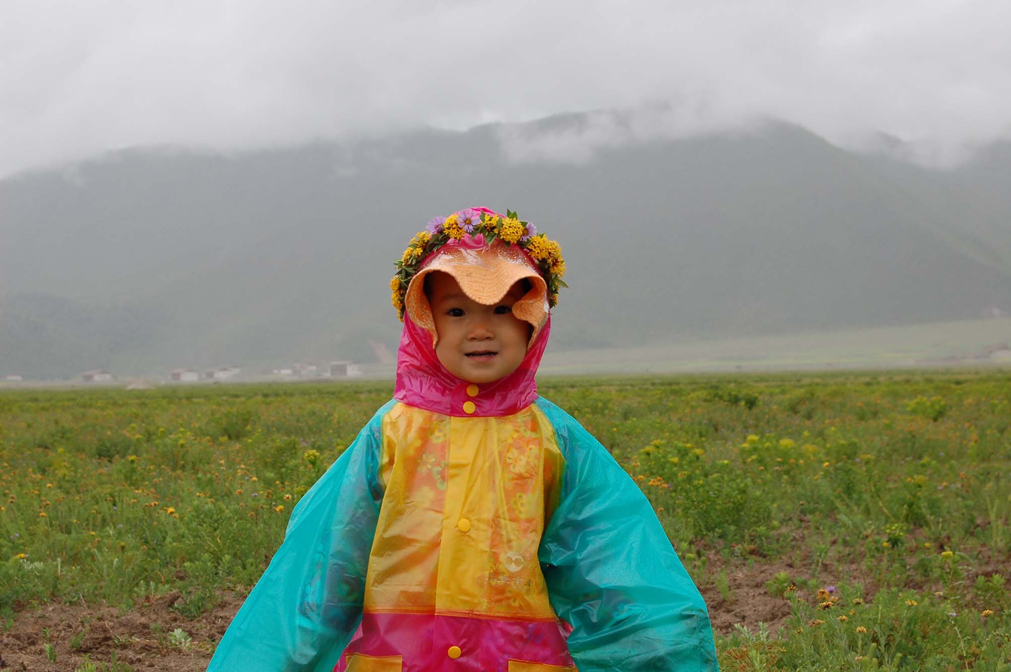下雨了。清扬婉兮穿上了雨衣,还是舍不得摘下藏族小姑娘给编织的花环。花环是用摘来的格桑花做的,那可是藏民的吉祥花呢。不过我们还听说格桑花又叫做小狼毒,还叫断肠草,草原上出现大量的小狼毒是草原退化的标志。
