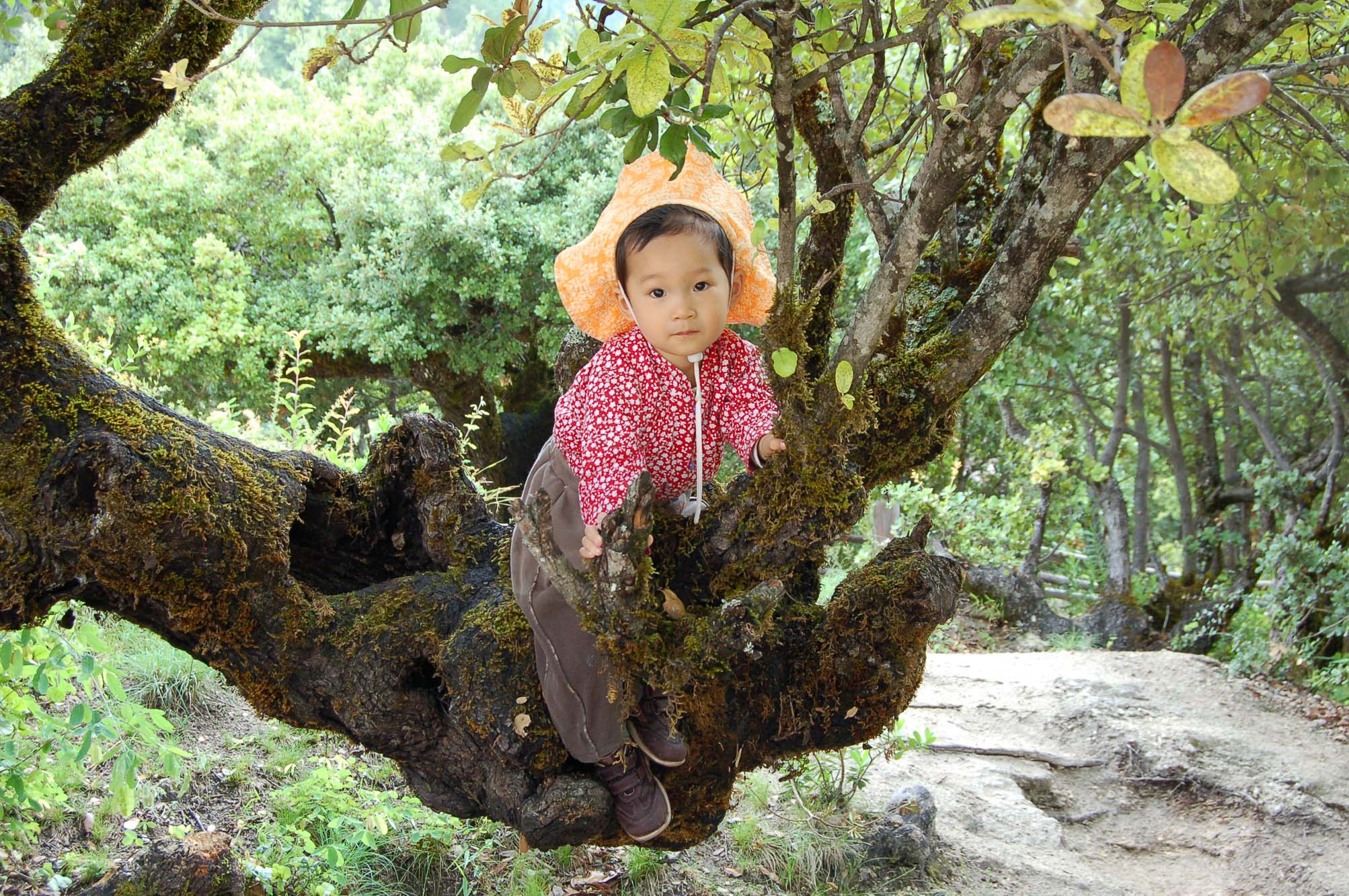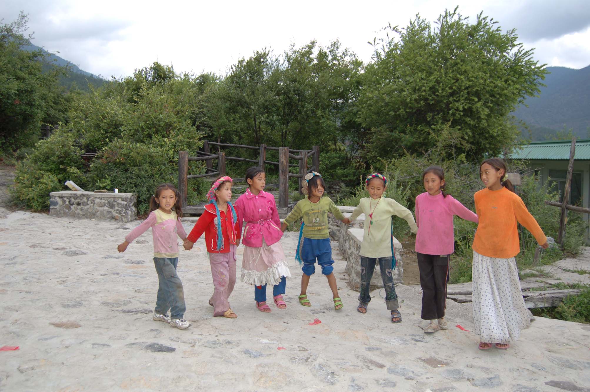 景区的入口处,照例有一些牵马的纳西人拥上来游说我们骑马。我们事先已经知道景区不大,骑马最多也就节省三五分钟而已,因此婉言拒绝。走不了五分钟,果然就没有了马道,只有木头搭成的栈道。栈道的入口处有一群纳西族的小孩子在玩耍,看见我们便围过来要给我们唱歌和跳舞。我问他们要多少钱,都说是随便给多少都可以。我在兜里找了找,发现有十块钱的零钱,就给了比较大的那个小孩。小孩子们都很开心,就手拉手一边唱歌一边跳起舞来。我注意到他们的箩筐里都放着课本,这说明他们至少都可以上学。