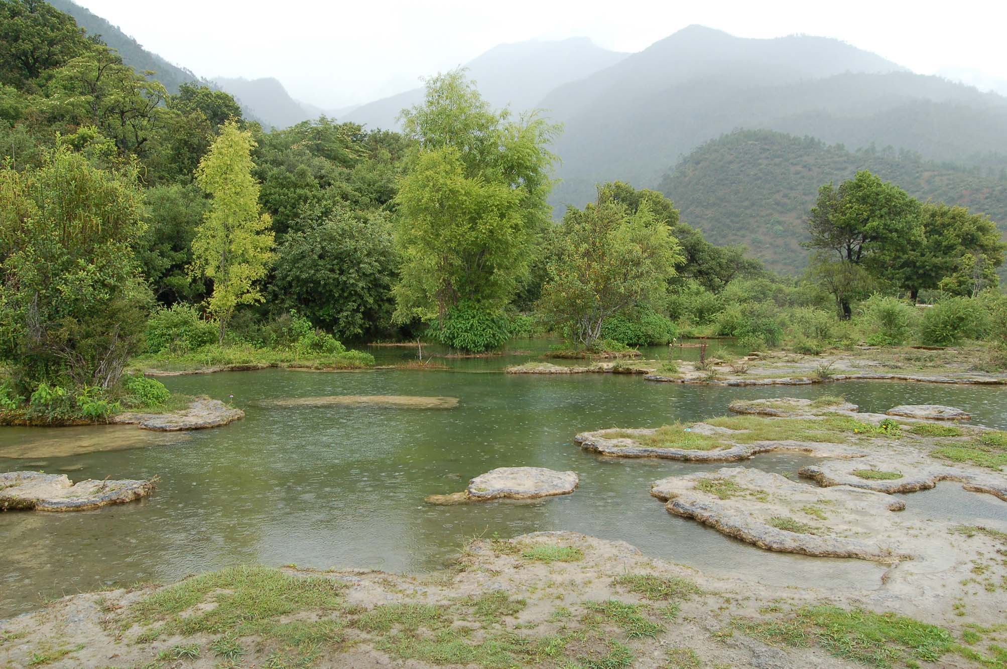 山区的天气变得真快。下车的时候还是艳阳高照,等我们爬到白水台顶上的时候却下起了雨。那些翠绿的树木披了雨珠,越发的显得清秀挺拔,活泼泼的招人开心。那些远处的大山,就若隐若现的躲藏在这乳白色的雨幕里了。而我最喜欢的,是和清扬婉兮一起把脚泡在水里,看那雨点轻轻的落在清澈湖面上,荡起一圈圈的涟漪,