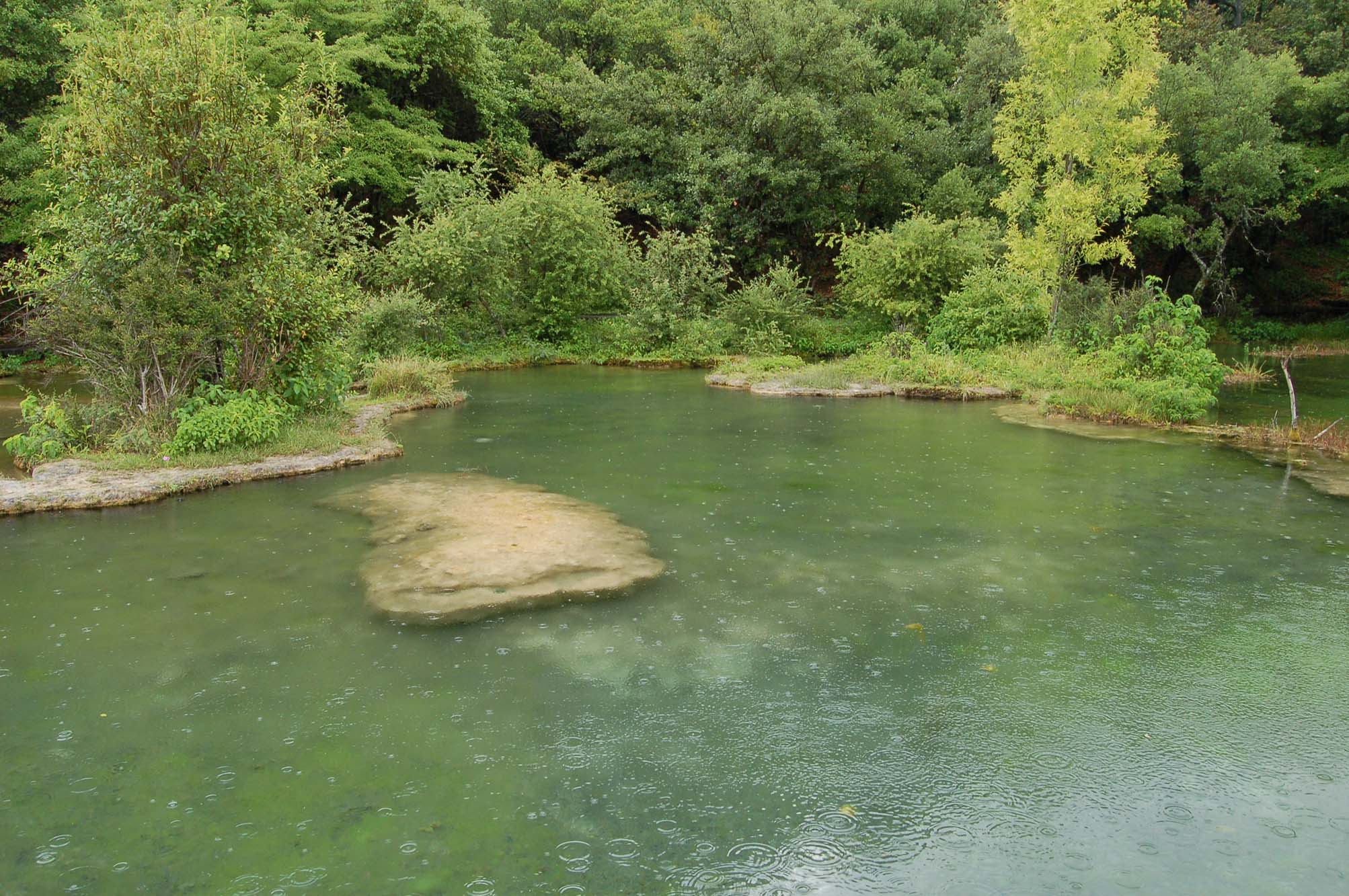 白水台的坡顶上到处都是湖。每一个湖都很小也很浅,最大的不过三五十平方米,最深处估计也就三四十公分吧。水很干净,放眼望去水底里的水草和小鱼儿一目了然,心底里就涌上一片清凉来。最妙的是这里还有雨,没有游人的喧哗,只有簌簌的雨声。
