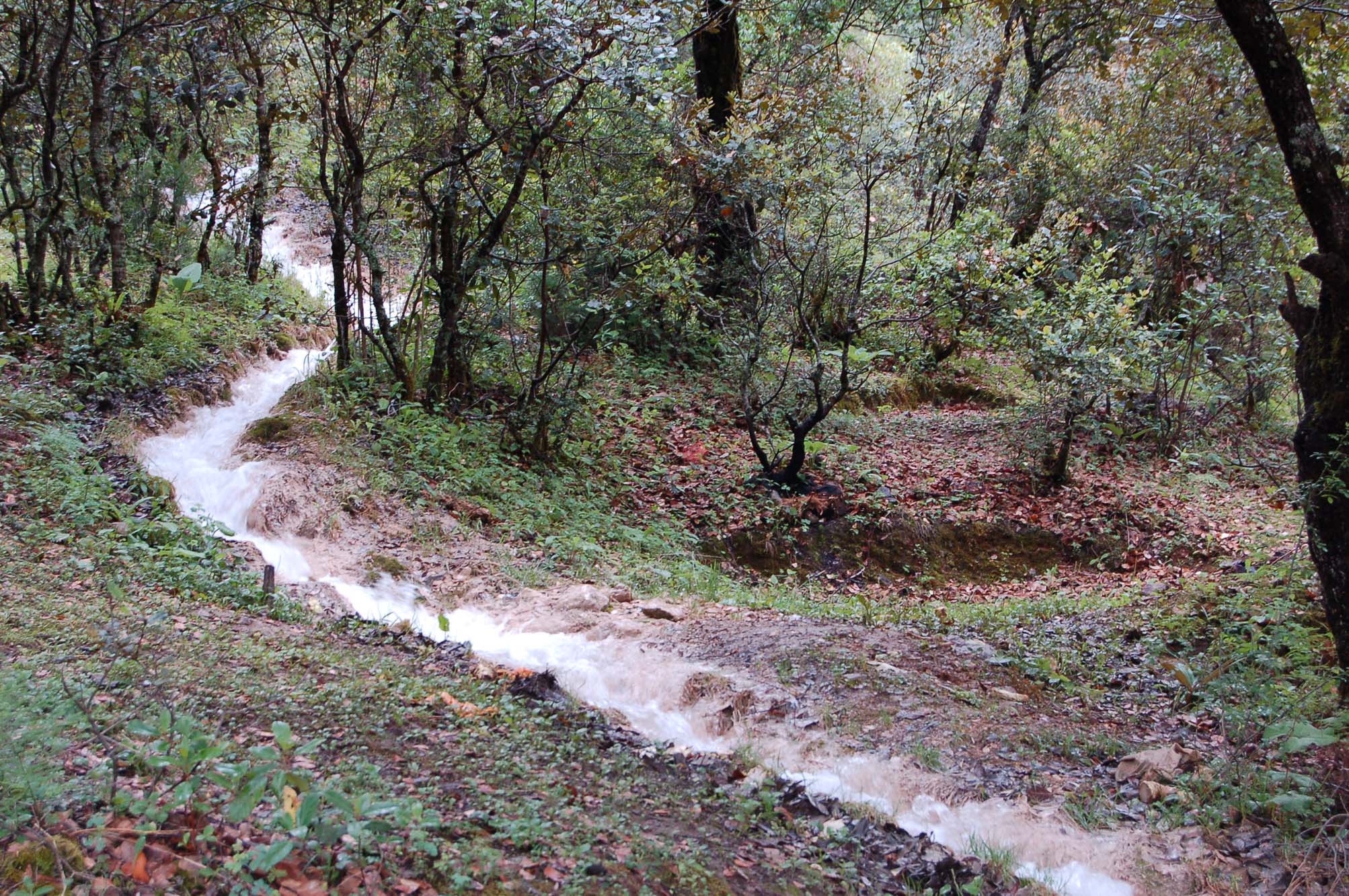 这条蜿蜒穿越森林的小溪,就是白水台的水源。这小溪就像是一个十一二岁的少年,吵闹着、歌唱着迫不及待的冲下山坡。到了坡度相对平缓的白水台,却又变成了十五六岁的少女,低着头,一句话也不说,温文尔雅地缓缓漫过整个石坡。