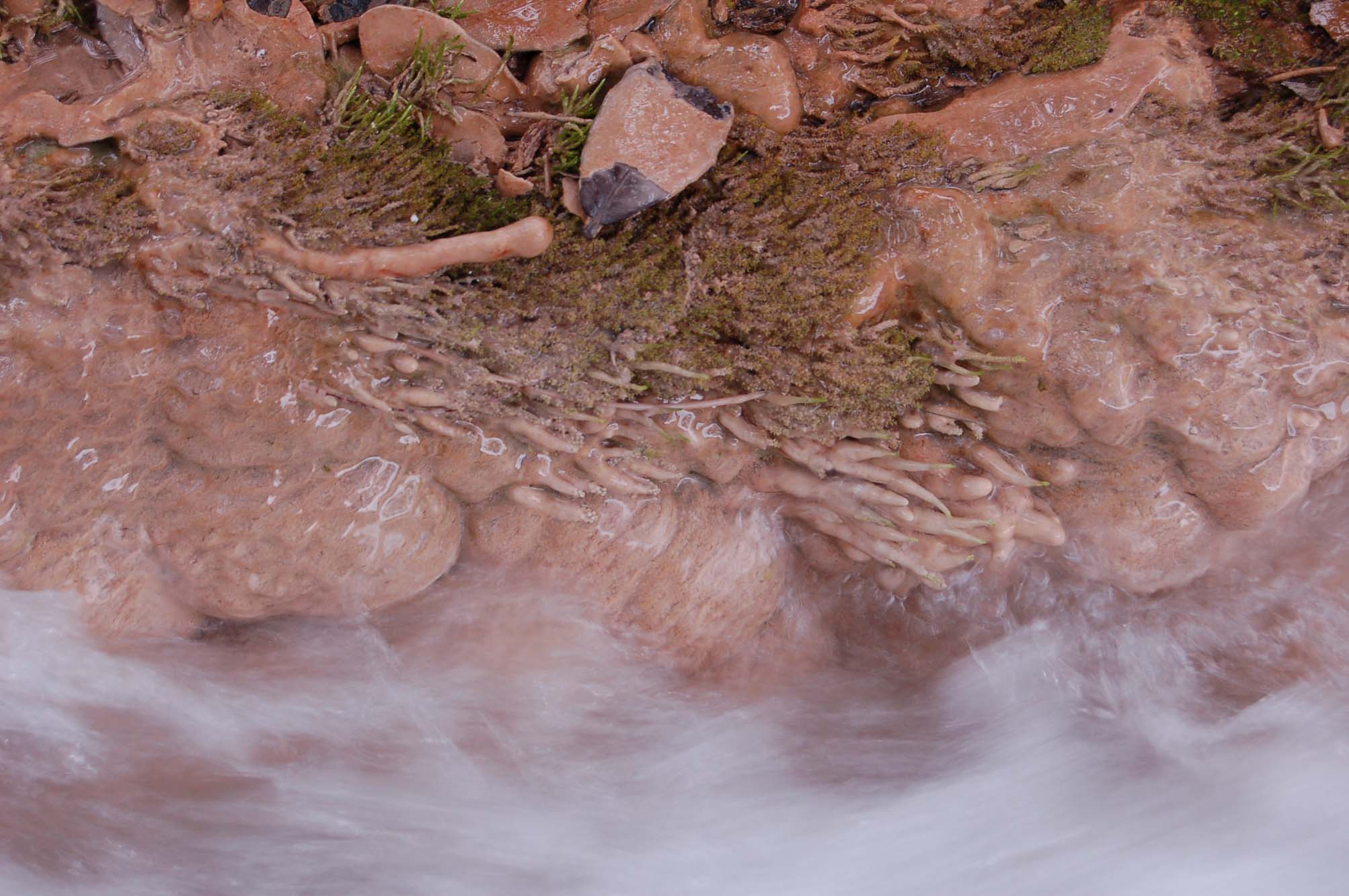 小溪的局部。白色的是奔涌而下的流水,黄色的是多年沉积下来的碳酸钙,点辍其中的绿色是青苔。