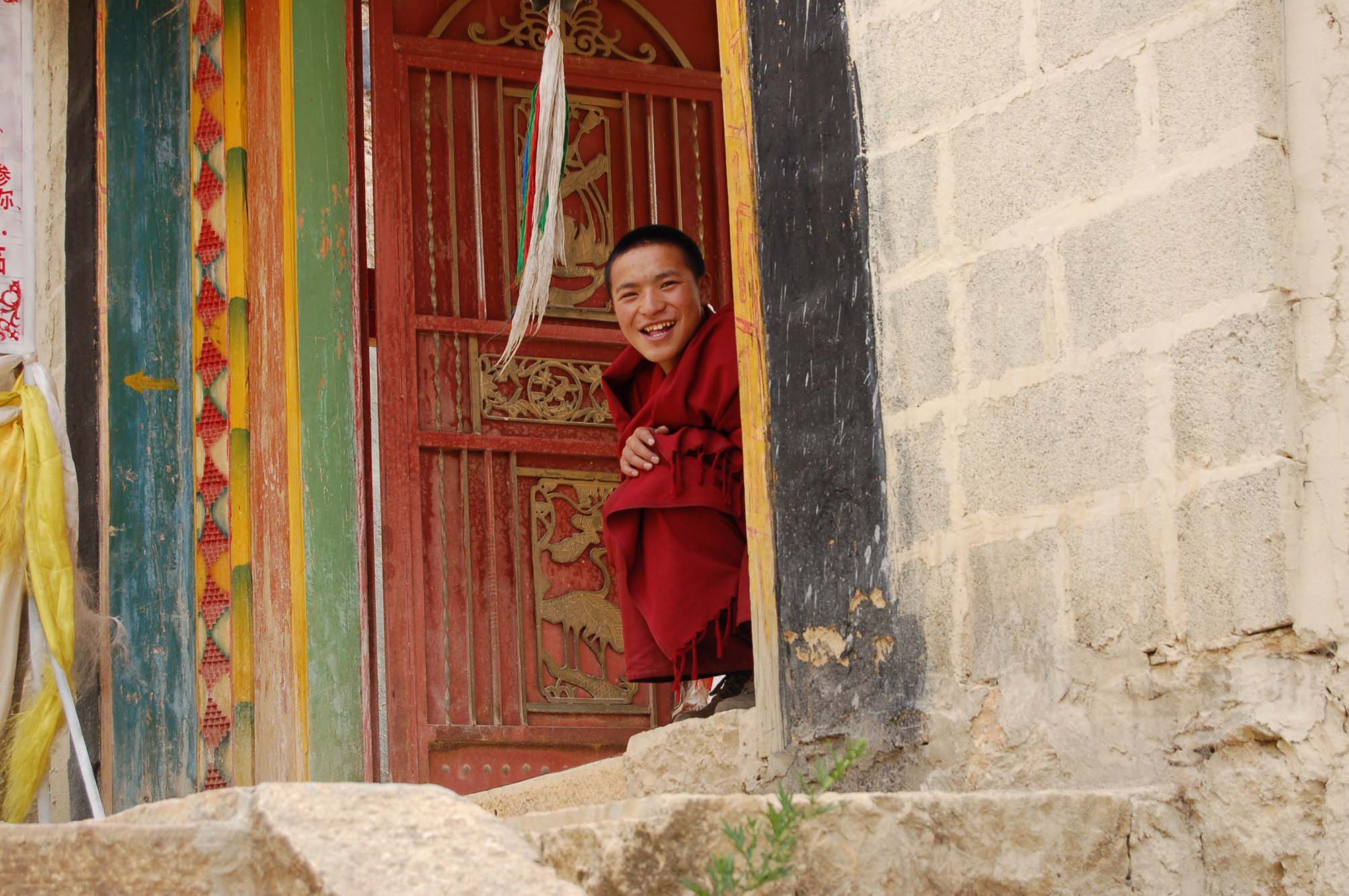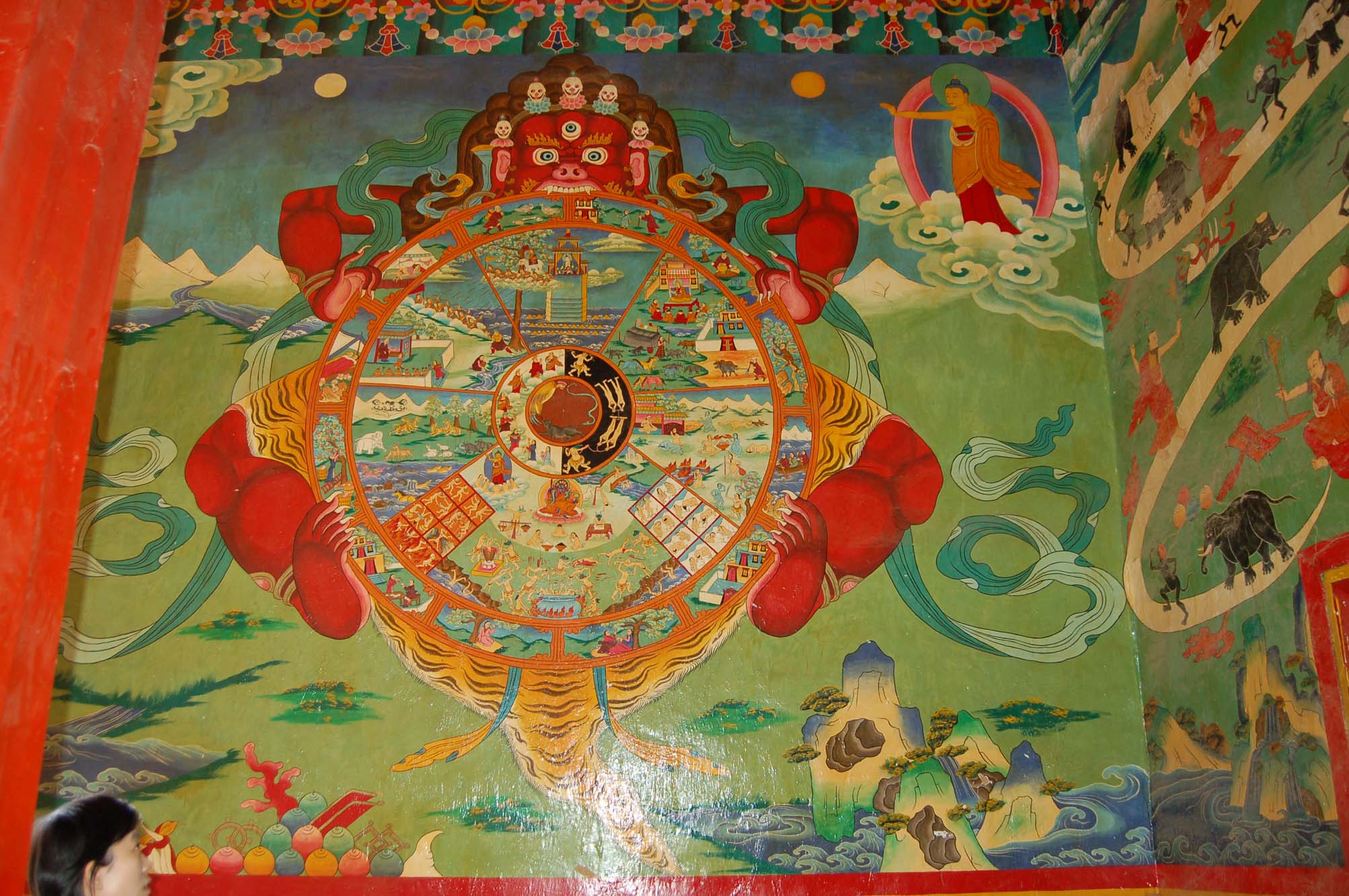 穿过一个破败的小巷子,发现自己站在一个院子的前面。院子门口立着一个红色的牌子,上面写着“吉地康仓”四个字。没有发现售票的人,但是偶尔有游人模样的进进出出,想来是一个可以参观的地方,于是就跟着其他的人进去。院子里长满了野草,看起来好久都没有人清理了,但是有很多穿着红色衣服的喇嘛在活动,有说笑聊天的,也有生火做饭的。进了门厅,立即满墙通红的壁画吓了一跳。南边的墙壁上是著名的六道轮回图,几年前在达赖喇嘛所著的《生命的意义》一书中见过,只是没想到实物竟然如此之大。西边的墙壁上画了一条道路,佛陀赶着一只黑色的猴子和黑色的大象往前走,走啊走啊猴子和大象的脑袋就变白了,再后来猴子和大象的上半身都变白了。走到半路上碰见了树上的果子,猴子就拉着大象的尾巴耍赖皮不肯走了。再后来猴子就不见了,只有大象和佛陀继续往前走。最后大象的全身都变白了,它躺在地上上佛陀骑上来,变成了佛陀的坐骑。我们看了半天,都不明白这是什么意思,只好作罢。北边的墙壁上画着四大天王,形象与汉传佛教的四大天王有一定的差异,不过还是可以分辨出来。东边的墙壁上画得似乎是佛陀和宗喀巴大师,不太确定。