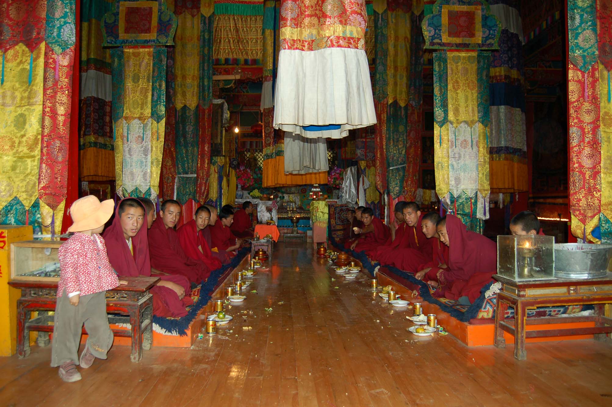 门厅和大殿之间还隔了一道门,门上拉了一道帘子,从帘子上面看过去能够看见里面有二十多位喇嘛面对面坐成两排在叽里咕噜的诵经。坐在首座的喇嘛似乎比较年长,戴着一付金丝眼镜,一边诵经一边前后摇晃,一幅乐在其中的样子。年纪比较轻的喇嘛偶尔还交换手中的书本,但是嘴里似乎还是在诵经的样子,不知道他们在交流些什么。坐在队尾的是些小喇嘛,大的不过十一二岁,小的就只有五六岁的样子,互相挤眉弄眼地交换着什么秘密,偶尔想笑出来但是又不敢出声只好用手捂着嘴巴。最有意思的是所有的喇嘛前面都放着一个盘子,里面有一只香蕉和几片面包,旁边还有一罐红牛饮料!
