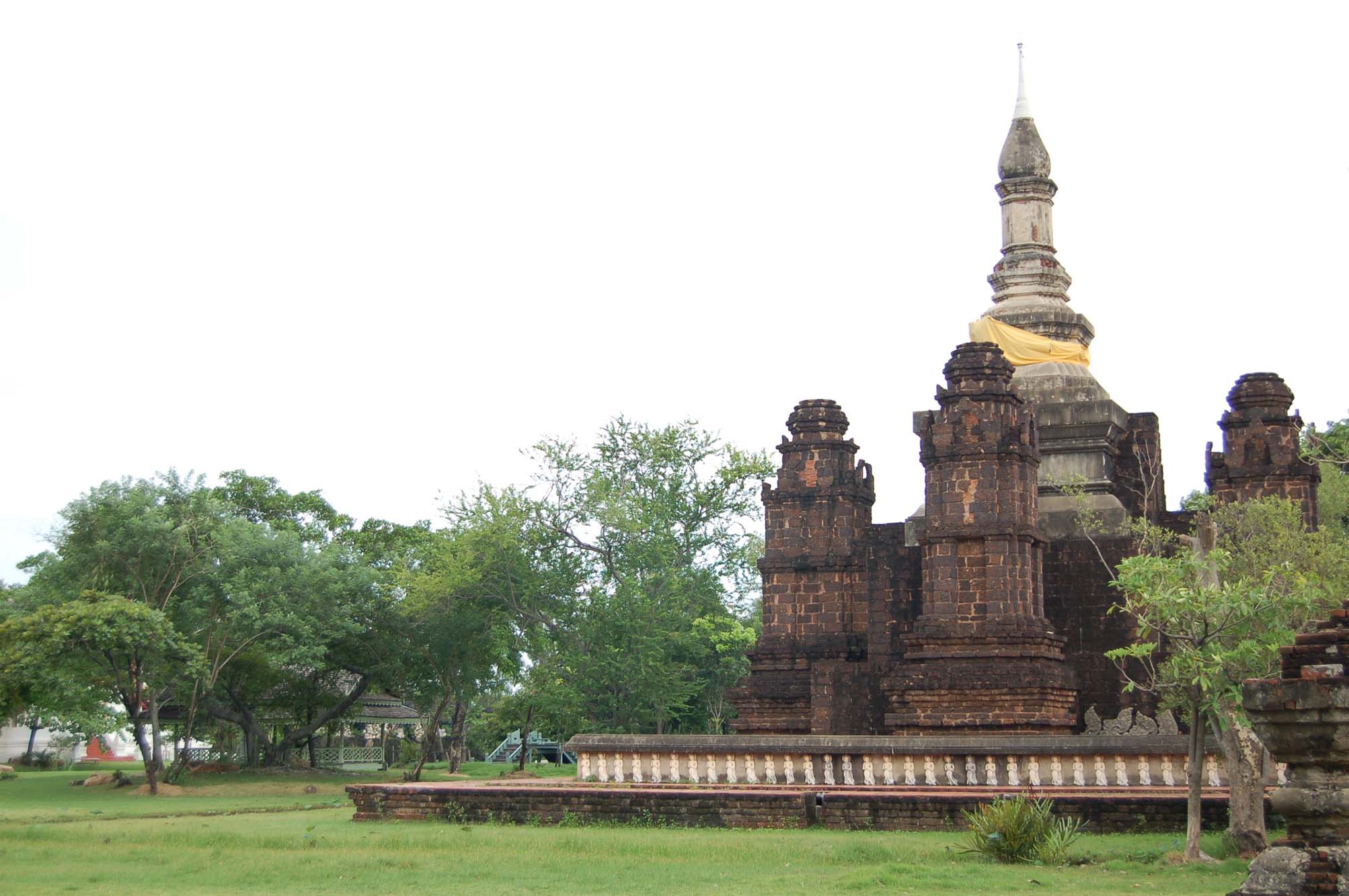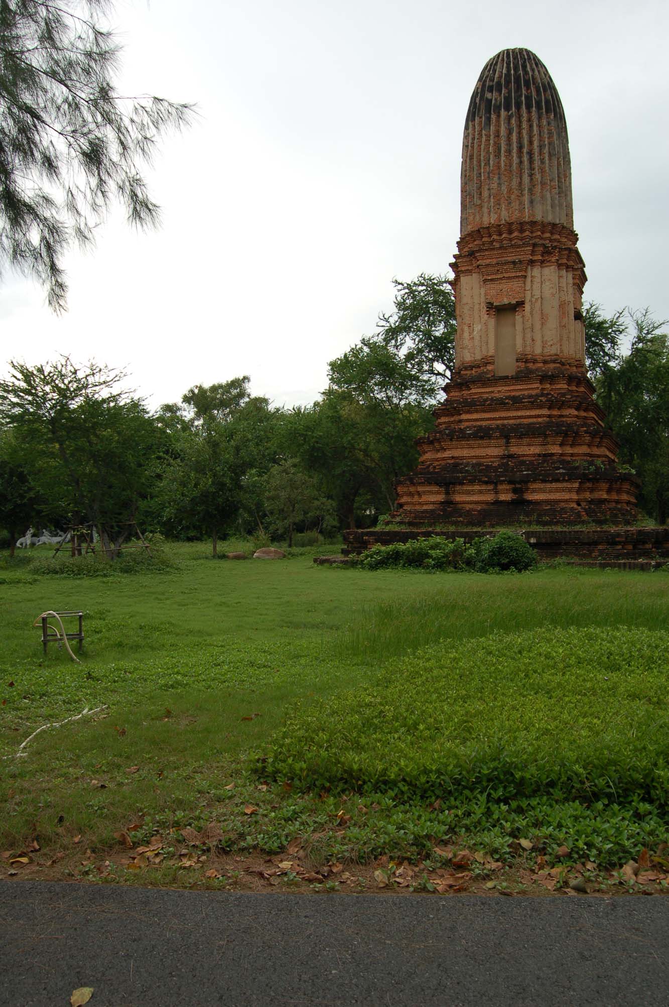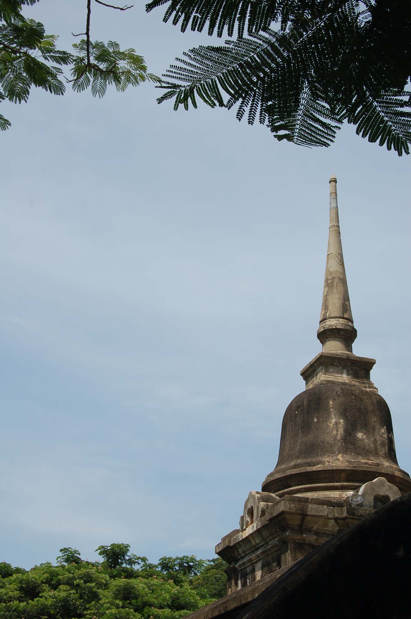 泰国的佛塔,基本上都有一个长长的尖顶。仰望塔身上这遍体的苔藓,心底里不由自主地就涌上一片清凉。那镏金的塔顶,又静静地在那里彰显着佛法的威严。