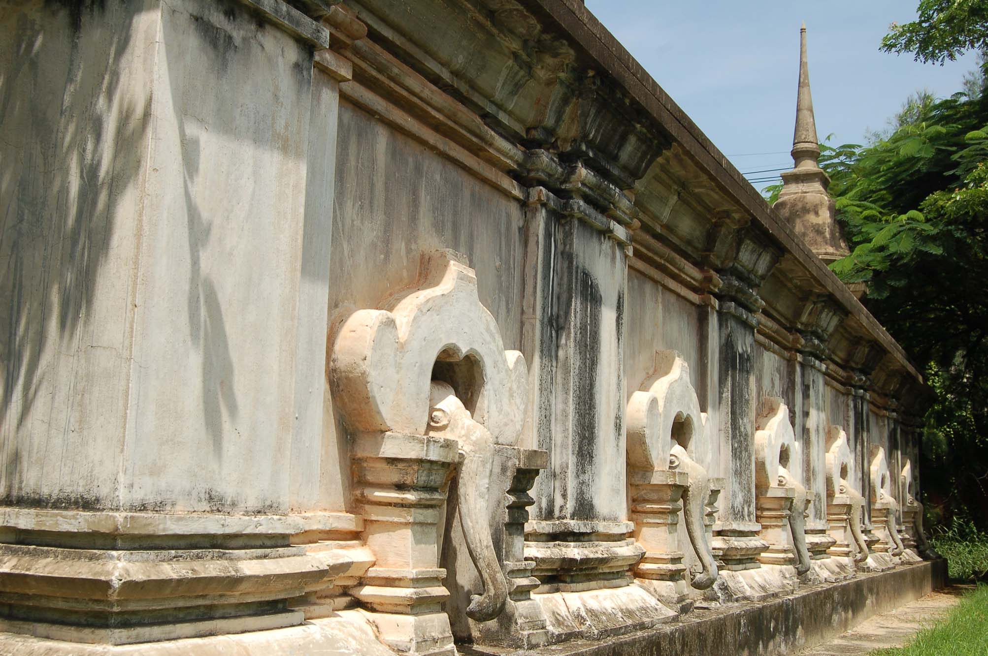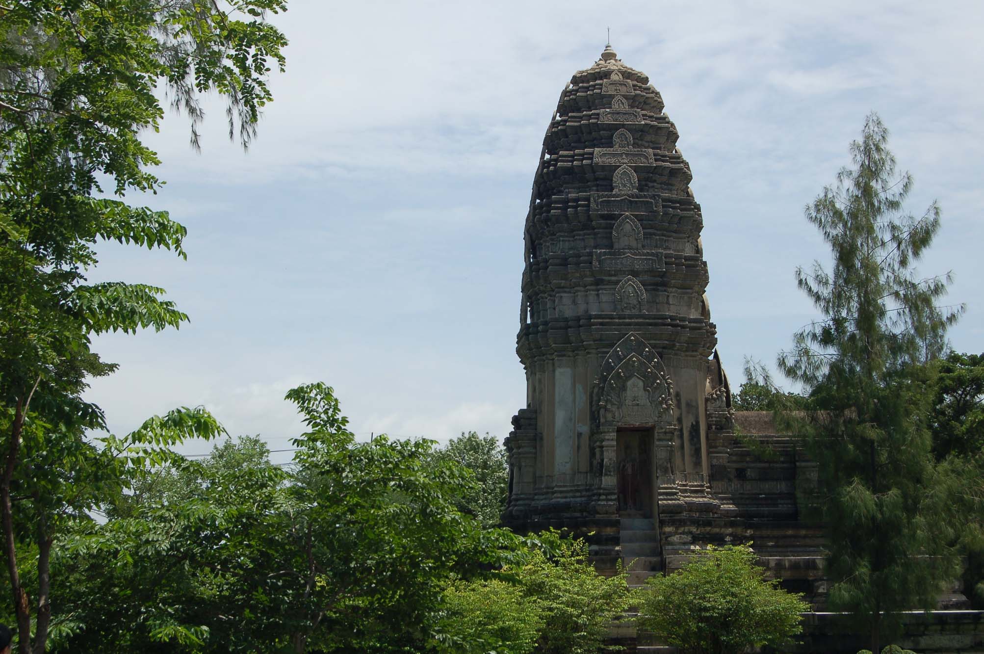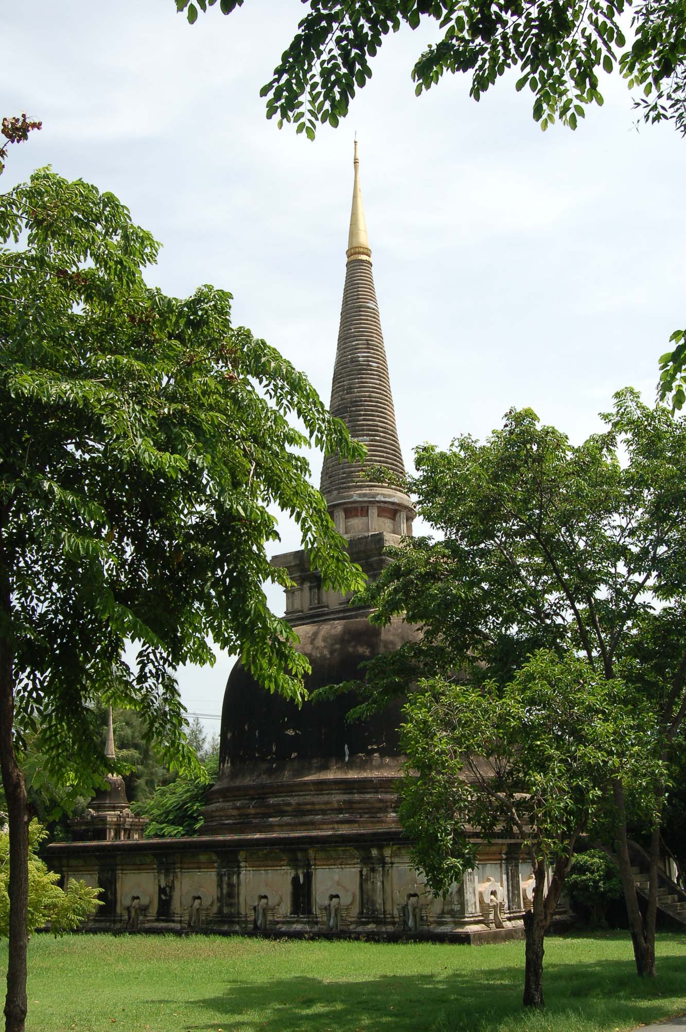 泰国的佛塔,基本上都有一个长长的尖顶。仰望塔身上这遍体的苔藓,心底里不由自主地就涌上一片清凉。那镏金的塔顶,又静静地在那里彰显着佛法的威严。