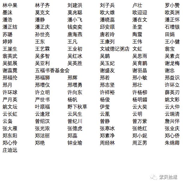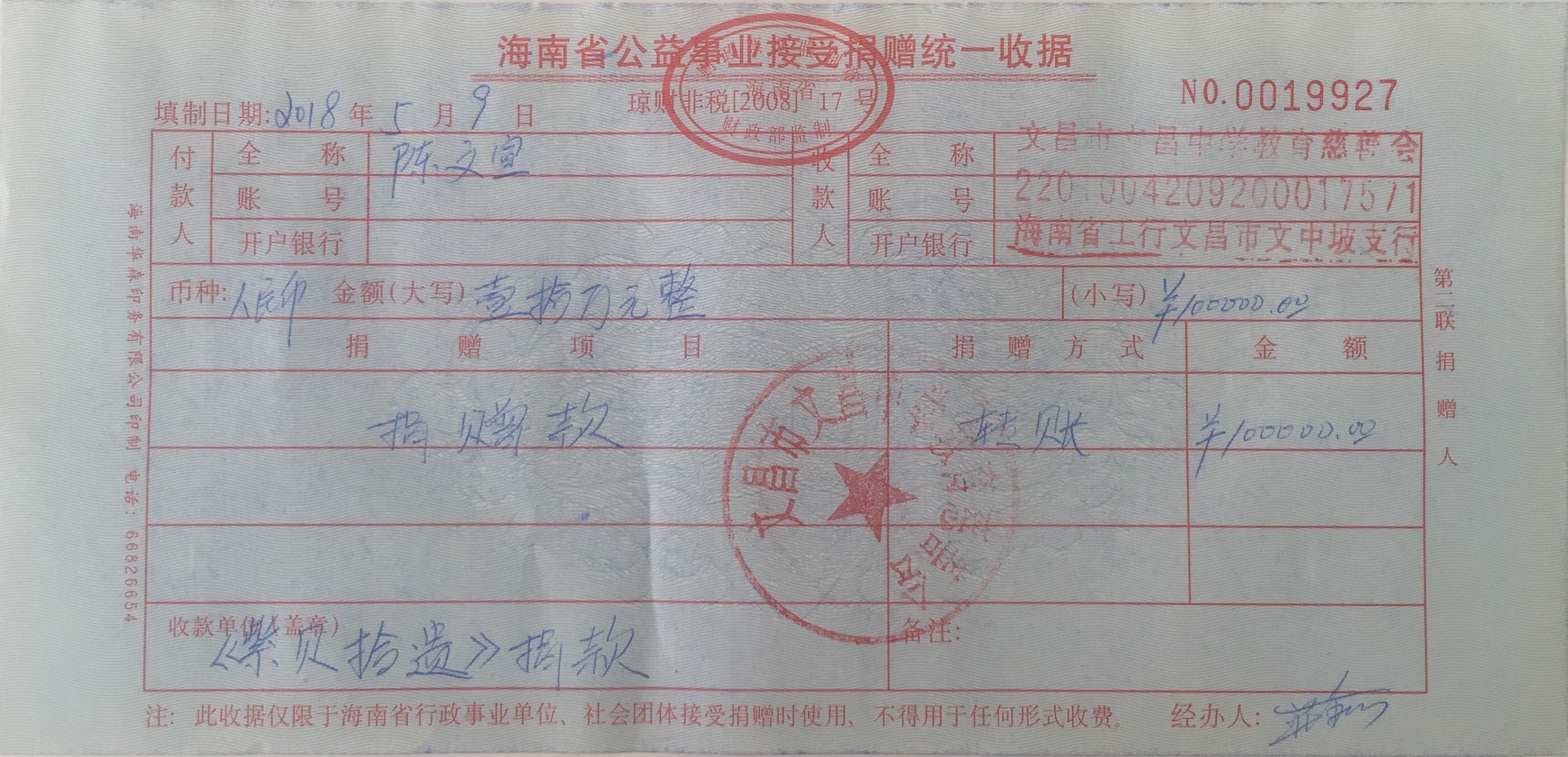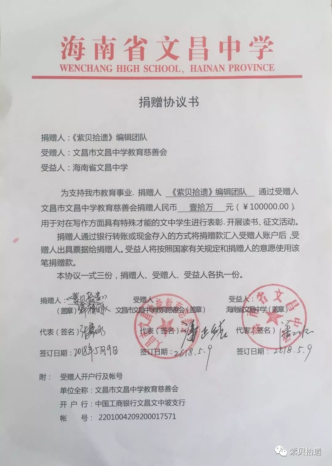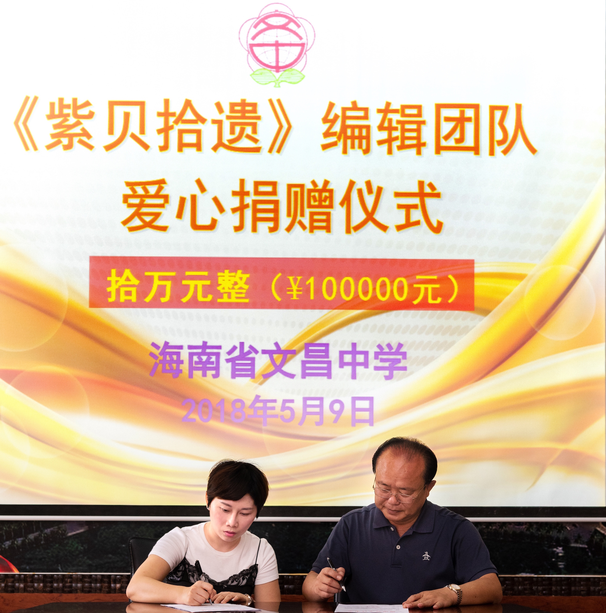5 月9 日,《紫贝拾遗》副主编张寒冰女士代表《紫贝拾遗》一书全体作者和读者向文昌中学捐赠售书款人民币十万元整,用于对在写作方面具有特殊才能的文昌学子进行表彰和鼓励以及开展读书征文活动。借此机会,《紫贝拾遗》编辑团队再次对如下人士及社会团体表示衷心的感谢。