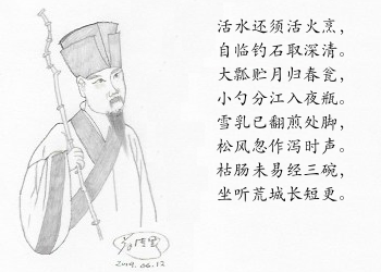 泡好茶当然需要有好水。苏公烹茶,对水可不是一般的挑剔。苏公闲居宜兴蜀山时,最爱金沙寺旁玉女洞金沙泉的泉水。这金沙泉离蜀山有十七八里路,苏公的书僮三天两头就得跑一趟,的确挺累的。这书僮人小鬼大,有一天心生一计,就近在蜀山边上的蠡河里挑了一担河水回来交差。